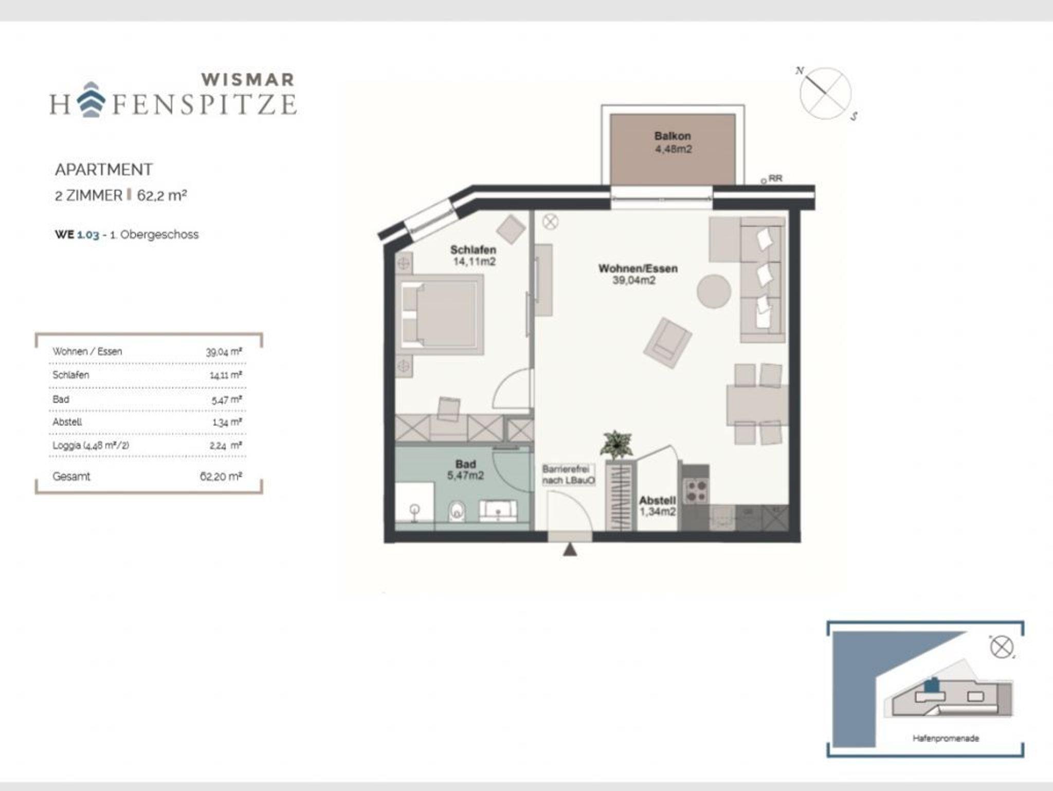 In der Hafenspitze befinden sich zudem eine Gäste Rezeption wie auch Gastronomie. Sie verbringen Ihren Aufenthalt in maritimer Umgebung und gelangen in wenigen Gehminuten zur Altstadt von Wismar mit historischen Bauten und Kirchen der Backsteingotik mit Aussichtsplattform und Blick über die Hansestadt. Die hier beschriebenen Ferienwohnung Hafenspitze 3 ist ein hochwertig möbliertes 2-Zimmer-Feriendomizil mit Loggia. Die Wohnfläche beträgt großzügige 63qm. Ein separates Schlafzimmer sowie zwei weitere Schlafmöglichkeiten und 1 moderndes Duschbad sind vorhanden. Bei Anreise sind bezogene Betten für 2 Personen inklusive. Bei Bedarf können weitere Wäschepakete hinzu gebucht werden. Die Belegung ist mit bis zu 4 Personen möglich. Es handelt sich um eine Wohnung für Nichtraucher.