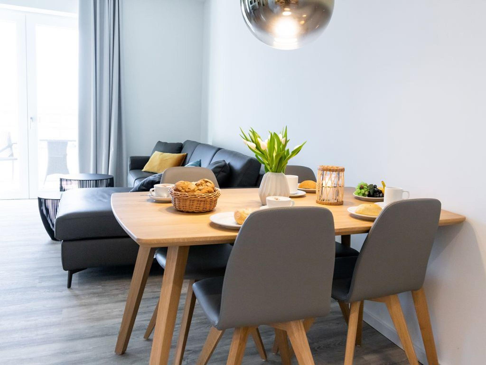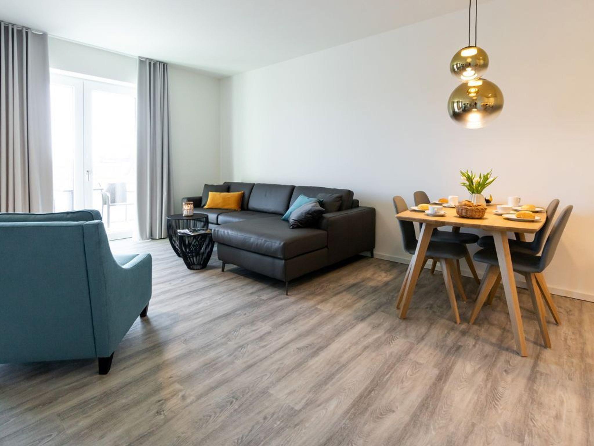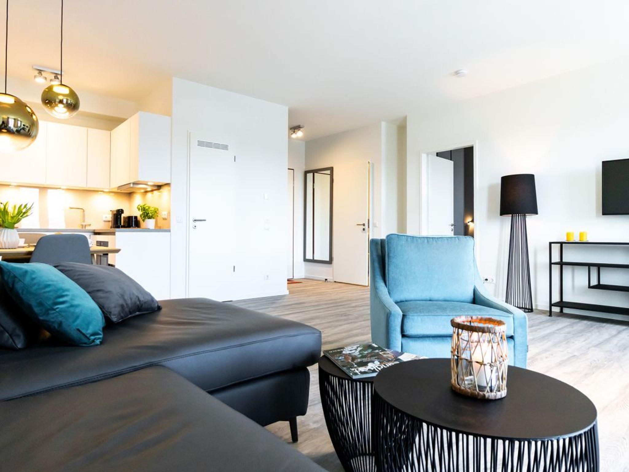 Das hochwertig möblierte 2-Zimmer-Appartement ? Hafenspitze 3- befindet sich in der 1. Etage und empfängt bis zu 2 Gäste mit einer geräumigen Wohnfläche von 63qm. Die zugehörige Loggia bietet interessante Aussicht auf Meer und Holzhafen. Sie bewohnen eine moderne Ferienwohnung direkt im Hafen, welche über einen schicken Wohn-Essbereich verfügt. Zudem ist eine voll ausgestattete, offene Wohnküche integriert, in der Herd, Backofen, Mikrowelle sowie Geschirrspüler und selbstverständlich auch Kaffeemaschine, Toaster usw. vorhanden sind. Ebenso bieten ein internetfähiges Fernsehgerät sowie Internetradio Unterhaltung und auch WLAN steht kostenfrei zur Verfügung.