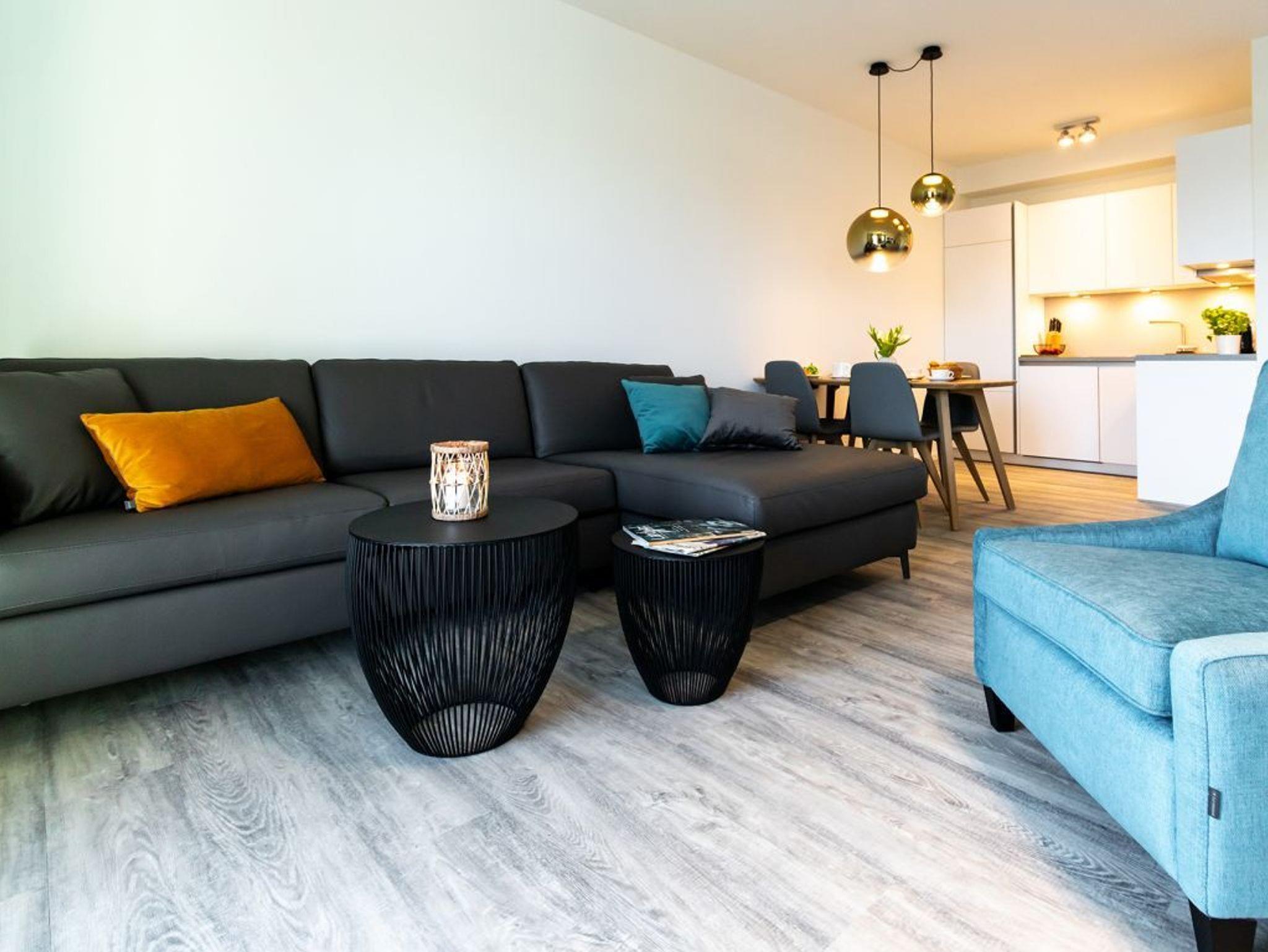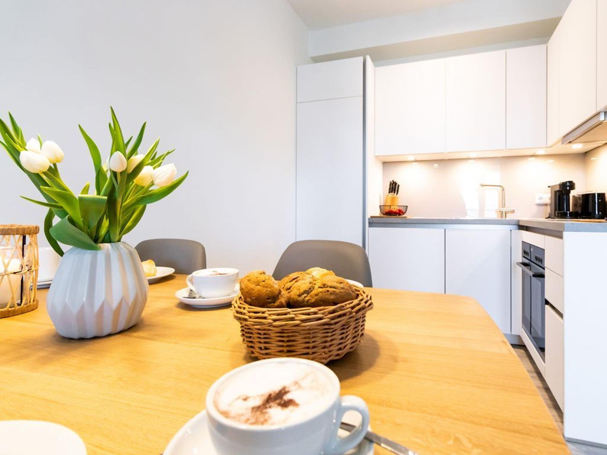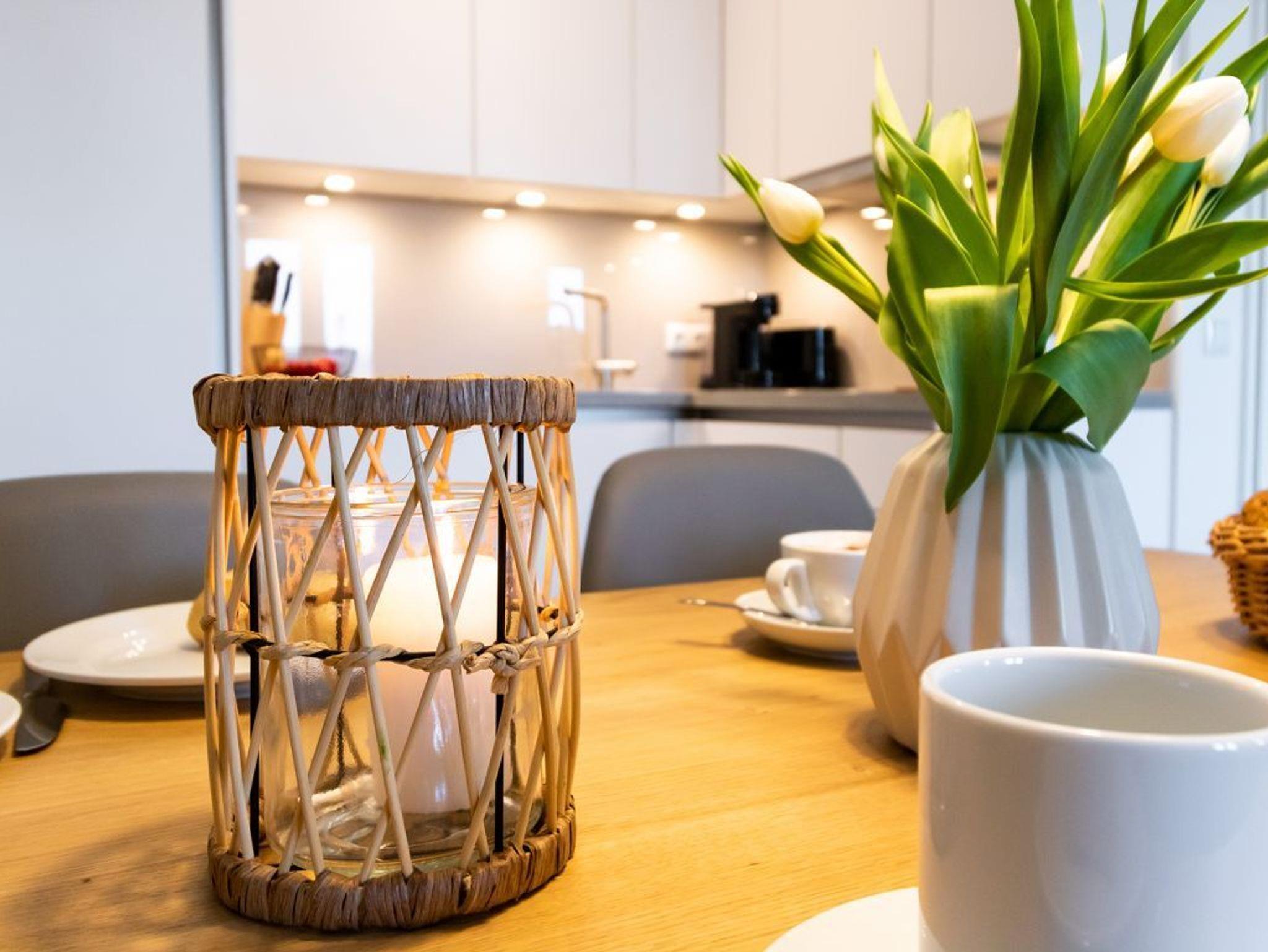 Das hochwertig möblierte 2-Zimmer-Appartement ? Hafenspitze 3- befindet sich in der 1. Etage und empfängt bis zu 2 Gäste mit einer geräumigen Wohnfläche von 63qm. Die zugehörige Loggia bietet interessante Aussicht auf Meer und Holzhafen. Sie bewohnen eine moderne Ferienwohnung direkt im Hafen, welche über einen schicken Wohn-Essbereich verfügt. Zudem ist eine voll ausgestattete, offene Wohnküche integriert, in der Herd, Backofen, Mikrowelle sowie Geschirrspüler und selbstverständlich auch Kaffeemaschine, Toaster usw. vorhanden sind. Ebenso bieten ein internetfähiges Fernsehgerät sowie Internetradio Unterhaltung und auch WLAN steht kostenfrei zur Verfügung.