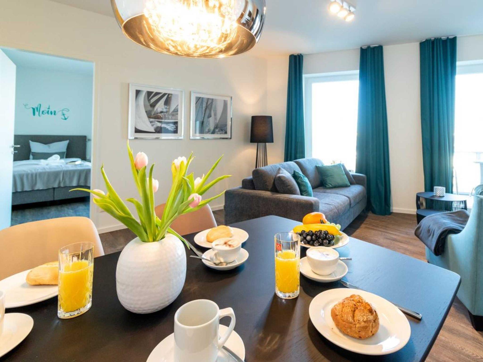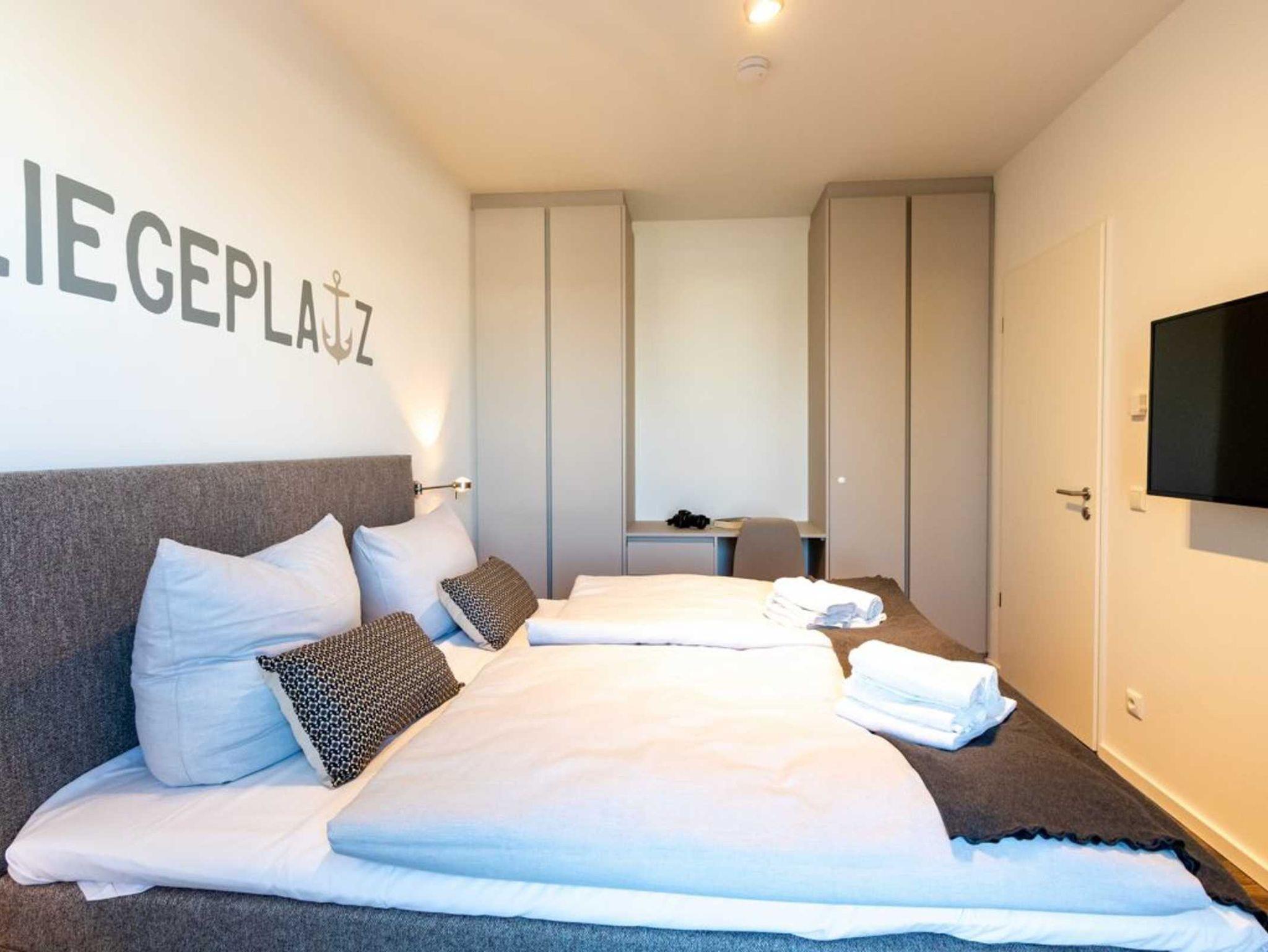 Internetfähiges Fernsehen mit Hotelmodus sowie ein Internetradio stehen ebenso zur Verfügung, wie kostenfreie WLAN-Nutzung. Das schicke Appartement bietet zudem einen saisonal möblierten Balkon in nördliche Ausrichtung, von dem Sie auf das Meer sowie den Holzhafen schauen. Die Belegung dieser Wohneinheit ist ideal für bis zu 3 Personen, da die großzügige Aufteilung mit zwei separaten Schlafzimmern nahezu ideal ist.
