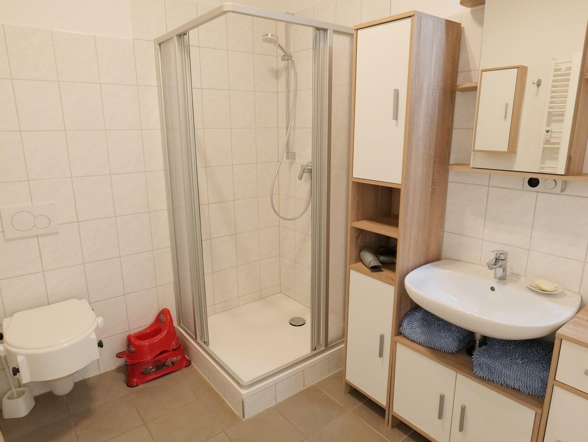 Badezimmer mit Dusche, WC, Waschbecken mit Spiegel, Duschstuhl