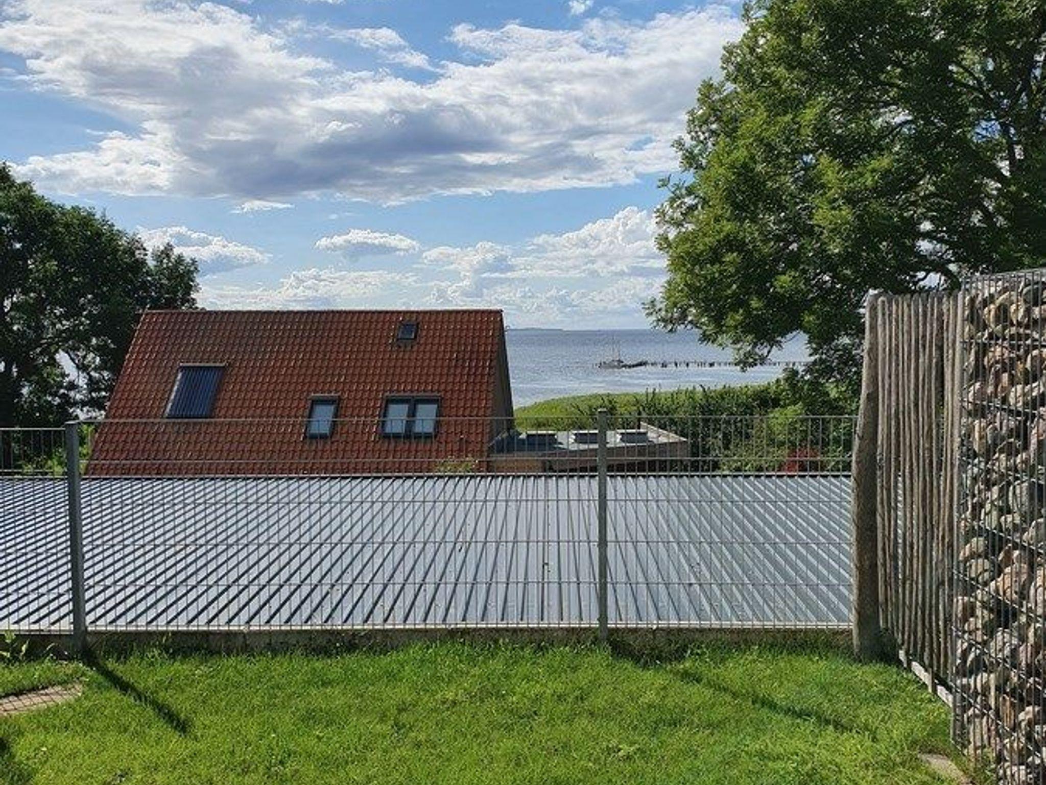 Auf der Terrasse, die vom Wohnzimmer aus begehbar ist, genießen Sie den Ausblick auf die Wismar-Bucht. Die überdachte Terrasse ist mit 2 Stühlen, 2 Loungesesseln und zwei Tischen aus wetterfestem Polyrattan ausgestattet. Ein kleines, eigenes Rasenstück rundet das Bild ab.