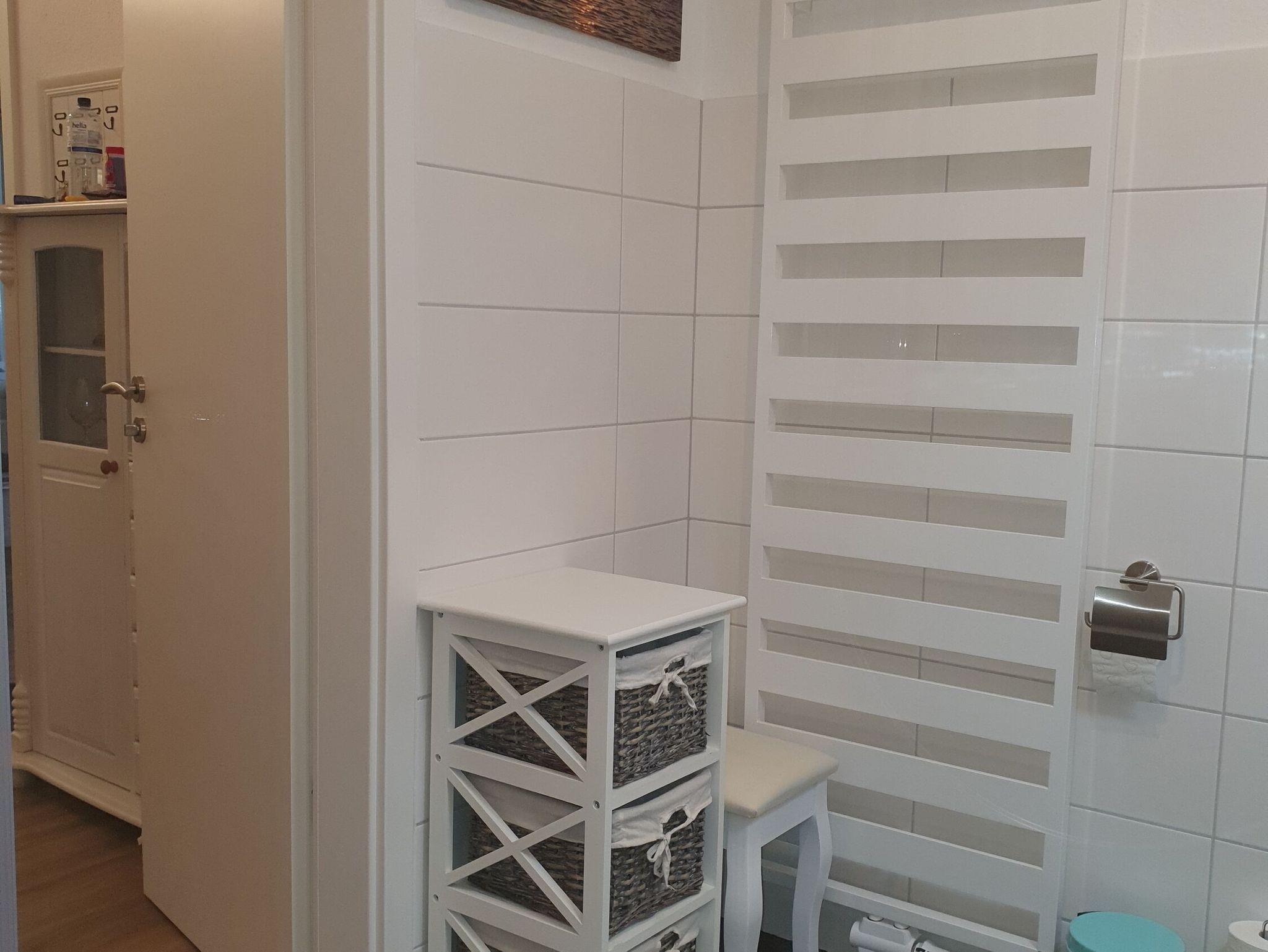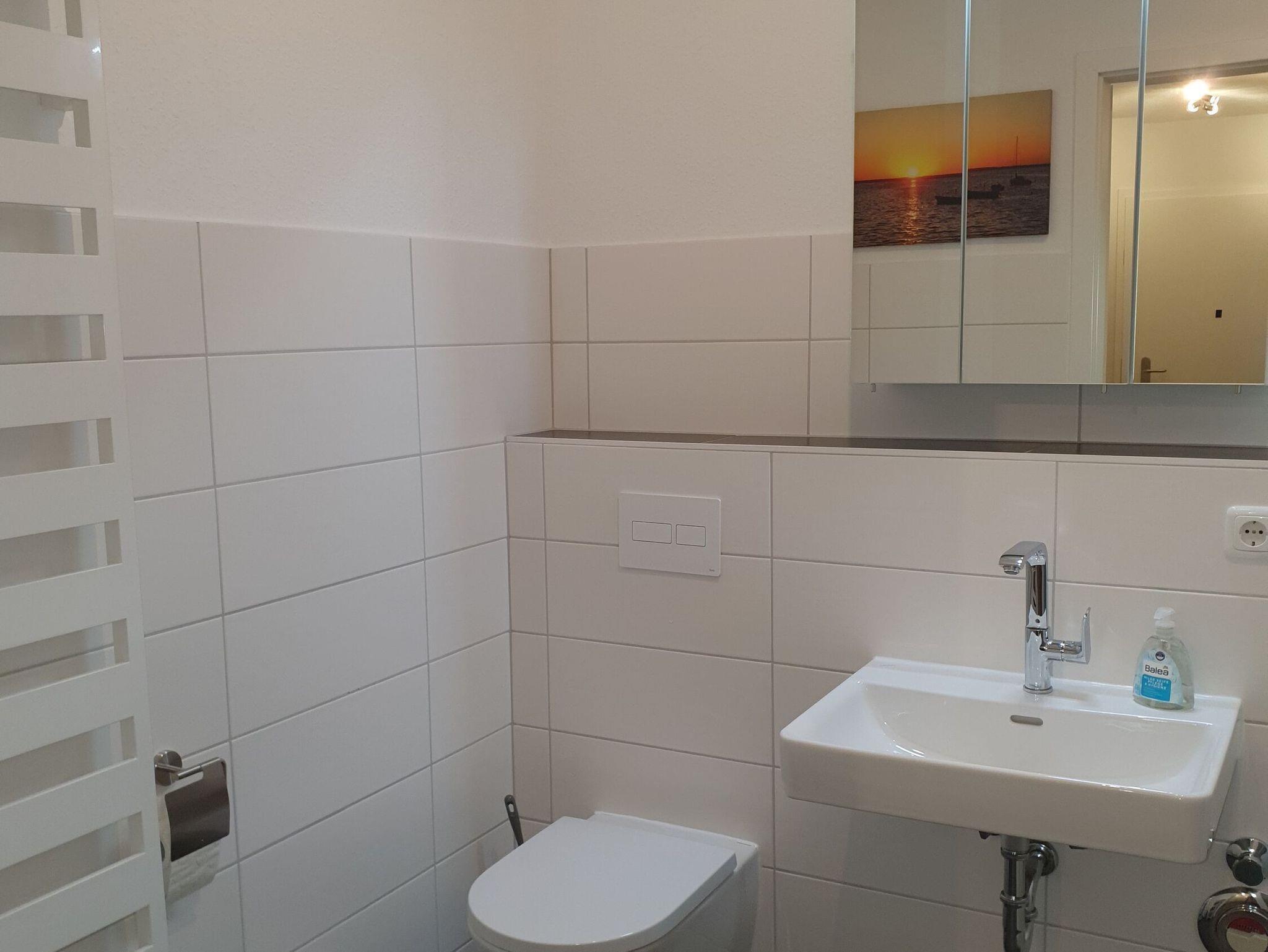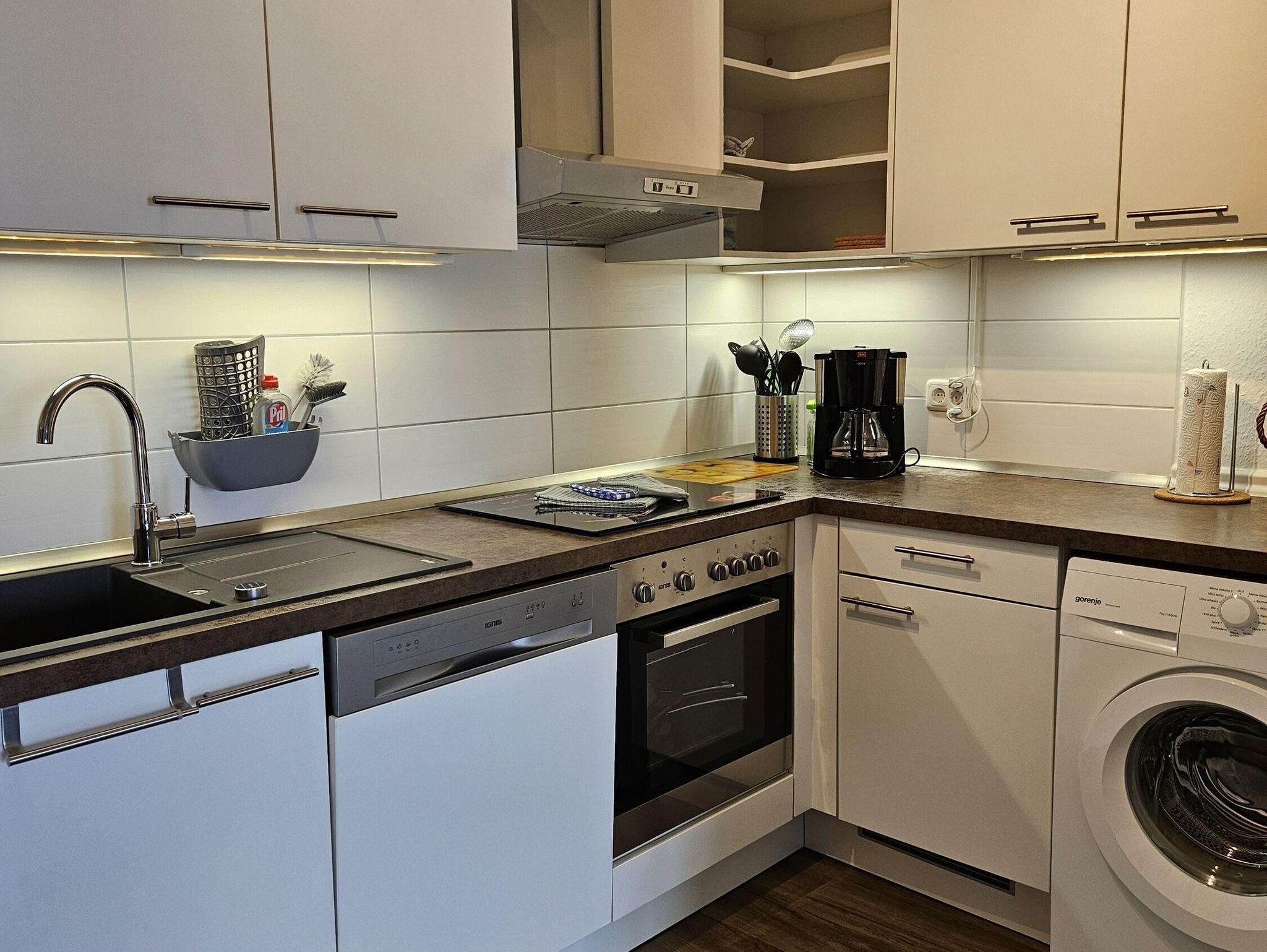 Die Ferienwohnung ist mit Kabel-TV, einer offenen Küche mit Ceranfeld und Backofen, Kühlschrank, Kaffemaschine und Toaster sowie Duschbad mit Waschmaschine ausgestattet. Kein Fön.