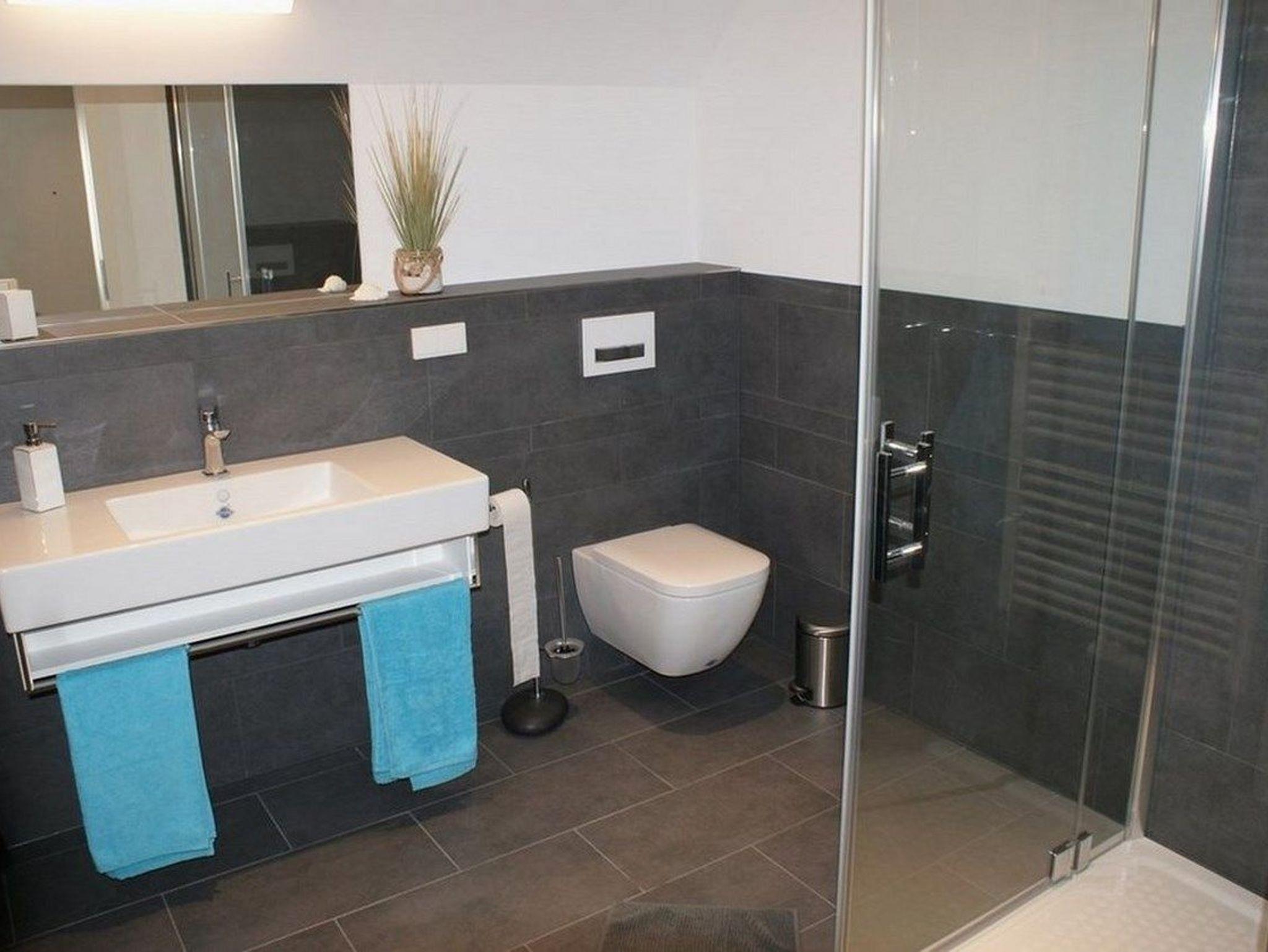 - Badezimmer mit Dusche, WC, großen Spiegelschrank
