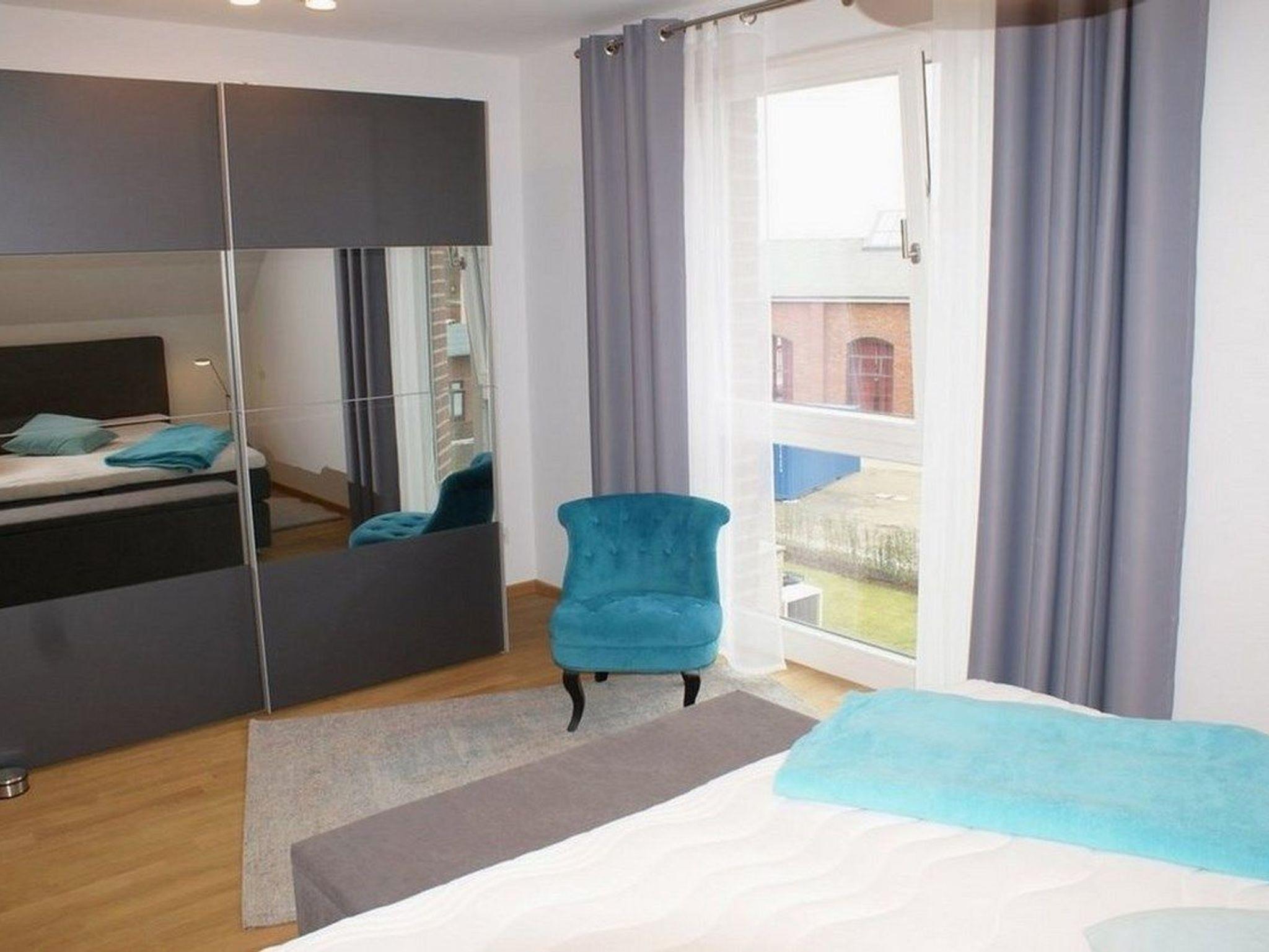 - Schlafzimmer mit gemütlichen Boxspring-Doppelbett (1,80 x 2,00 Meter), großer Kleiderschrank und Sessel