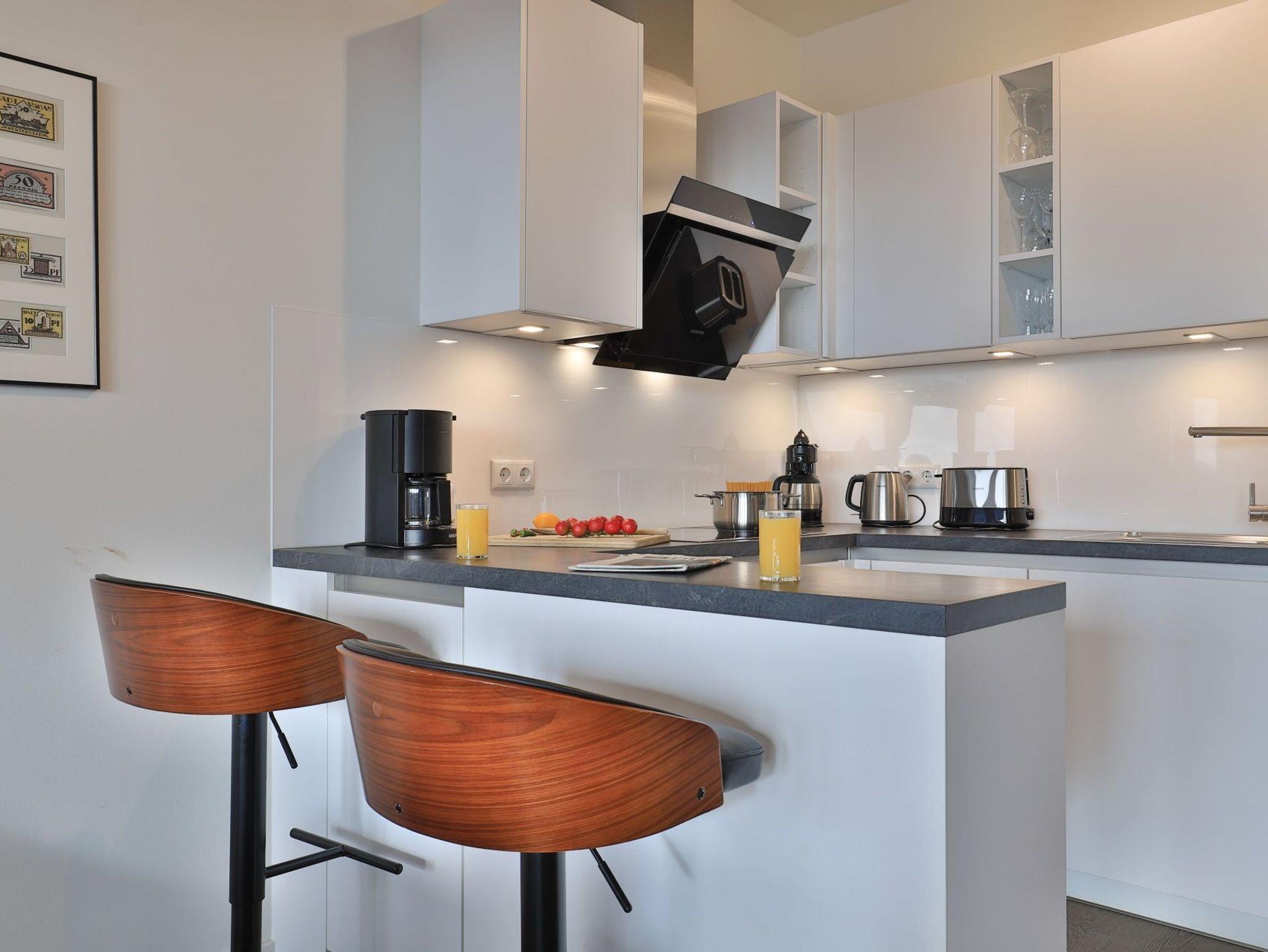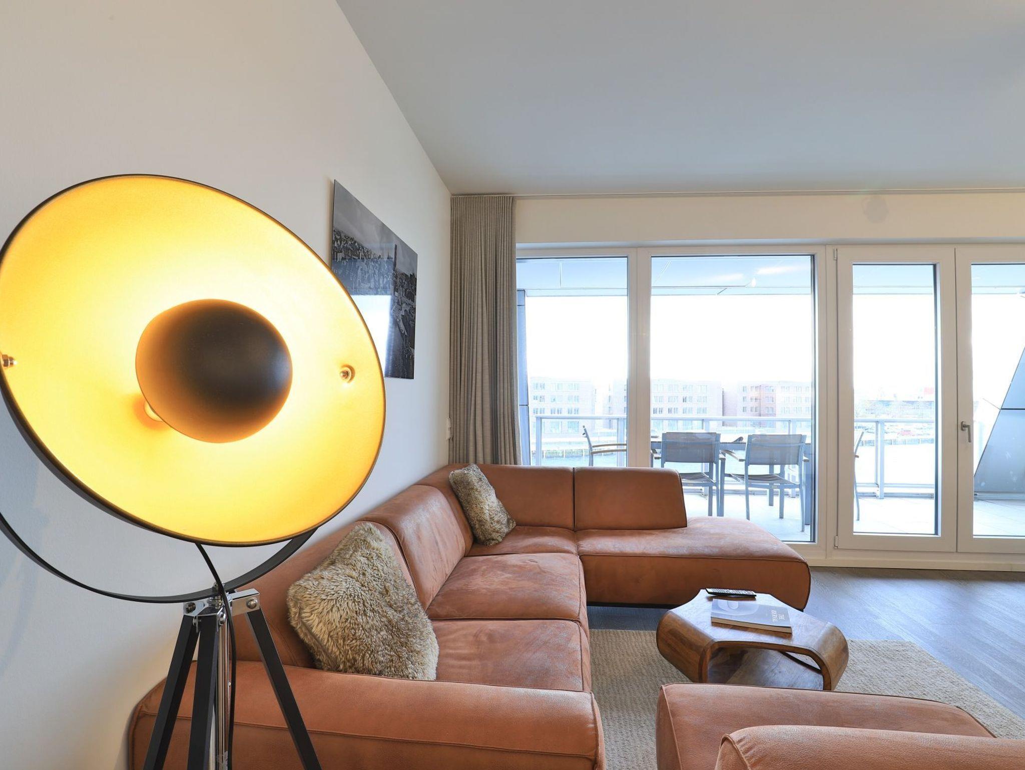 Sie betreten die Wohnung im 3. Obergeschoss des Gebäudes und gelangen über eine separate, in der Wohnung liegende Treppe, den schick möblierten Wohn/-Essbereich mit Esstisch sowie integrierter und voll ausgestatteter Wohnküche. Vom gemütlichen Wohnbereich mit Internetradio, Flachbild Fernseher mit Hotelmodus und kostenfreiem WLAN, gelangen Sie auf die Loggia in südwestliche Richtung. Von hier genießen Sie einen schönen Blick auf den Hafen. Das lichtdurchflutete Appartement verfügt zudem über zwei geräumige Schlafzimmer mit bodentiefen Fenstern.