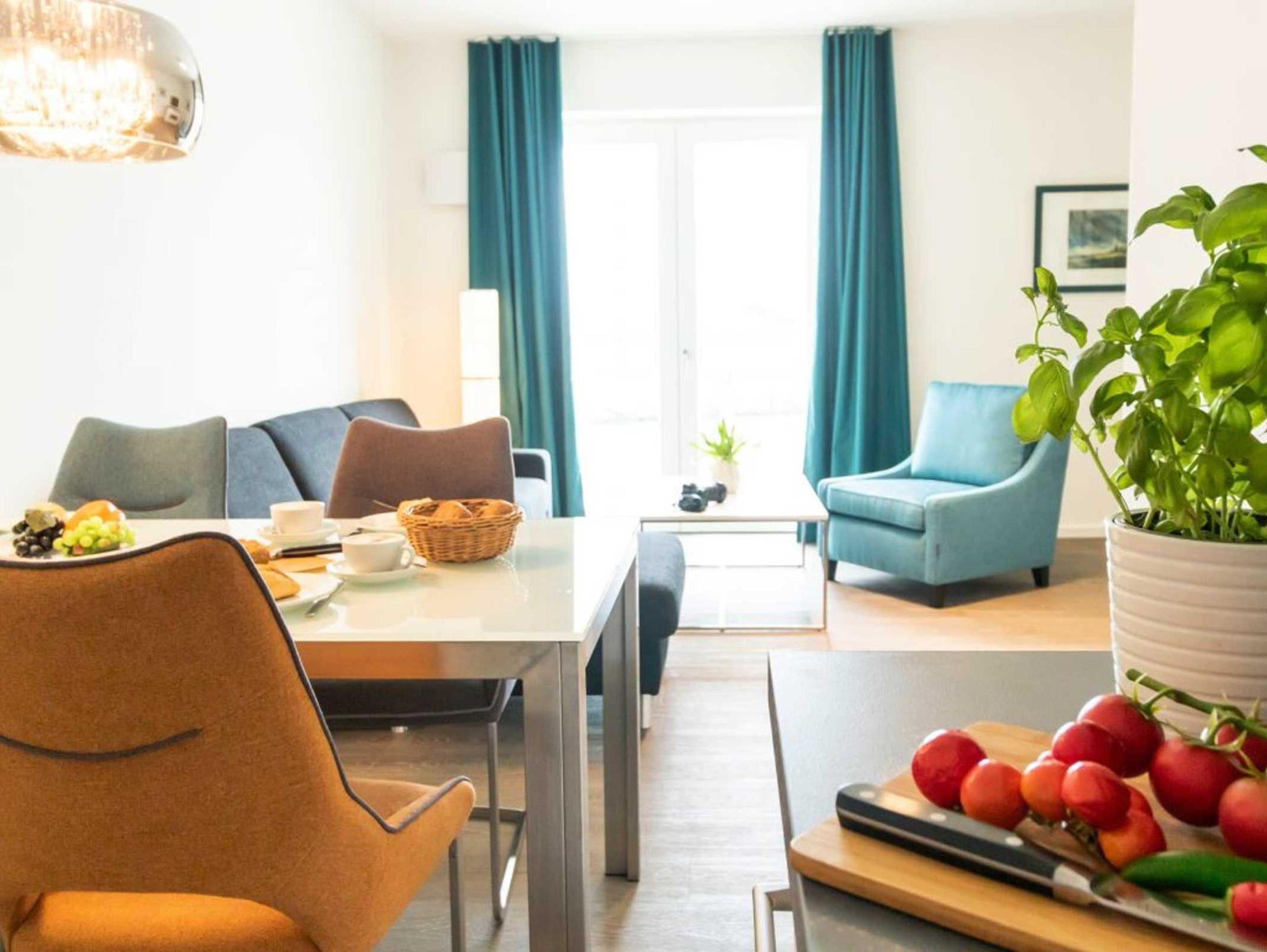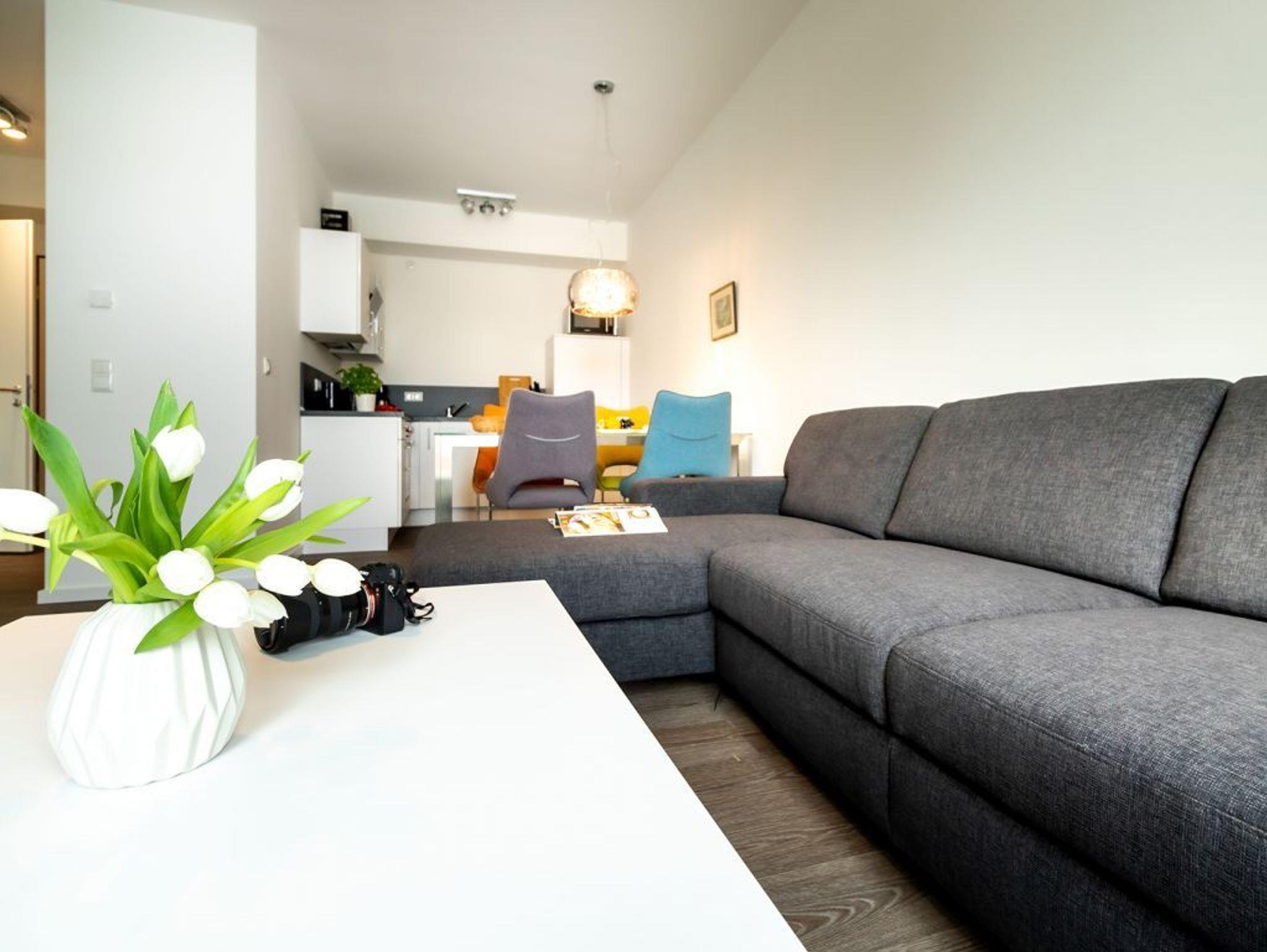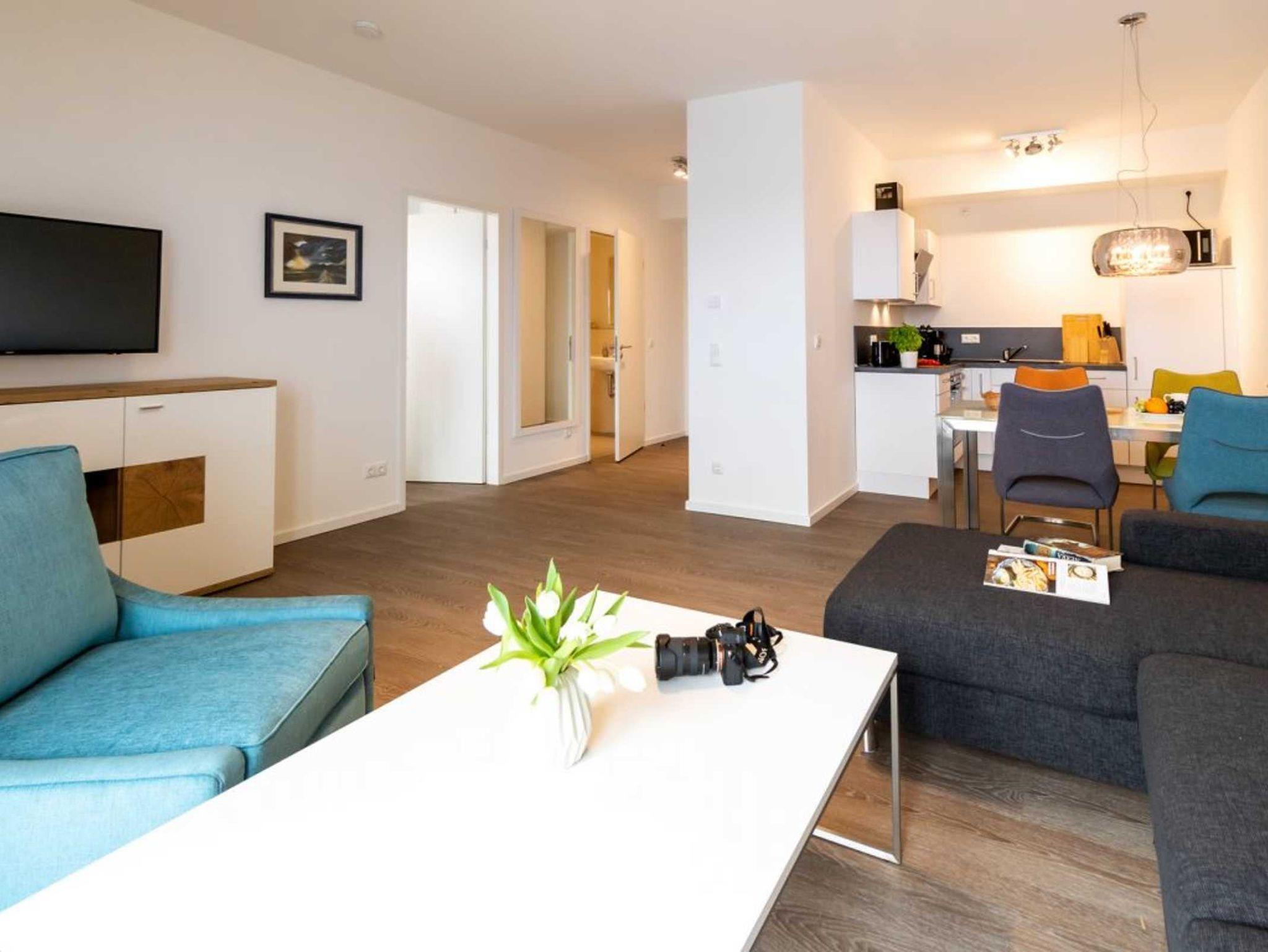 Im modernen Ambiente begrüßt Sie mit einer geräumigen Wohnfläche von 59qm dieses schicke 2-Zimmer-Appartement mit Balkon in der Hafenspitze 4. Die attraktive Ferienwohnung ist auf eine Belegung mit bis zu 4 Personen ausgelegt. Der geräumige Wohn-/ Essbereich mit bodentiefen Fenstern, lässt Sie komfortabel möbliert und zudem mit internetfähigem Flatscreen einen sehr angenehmen Aufenthalt genießen. Zwei zusätzliche Schlafmöglichkeiten, falls Sie mit mehr als 2 Personen anreisen möchten, sind vorhanden. WLAN steht kostenfrei zur Verfügung.