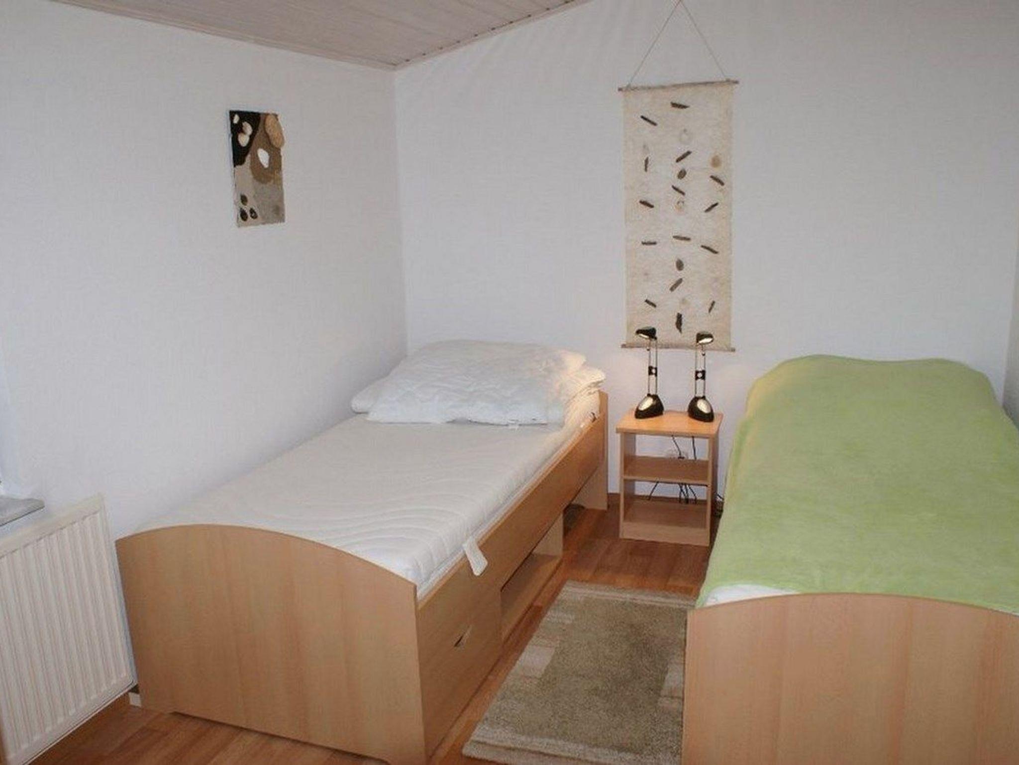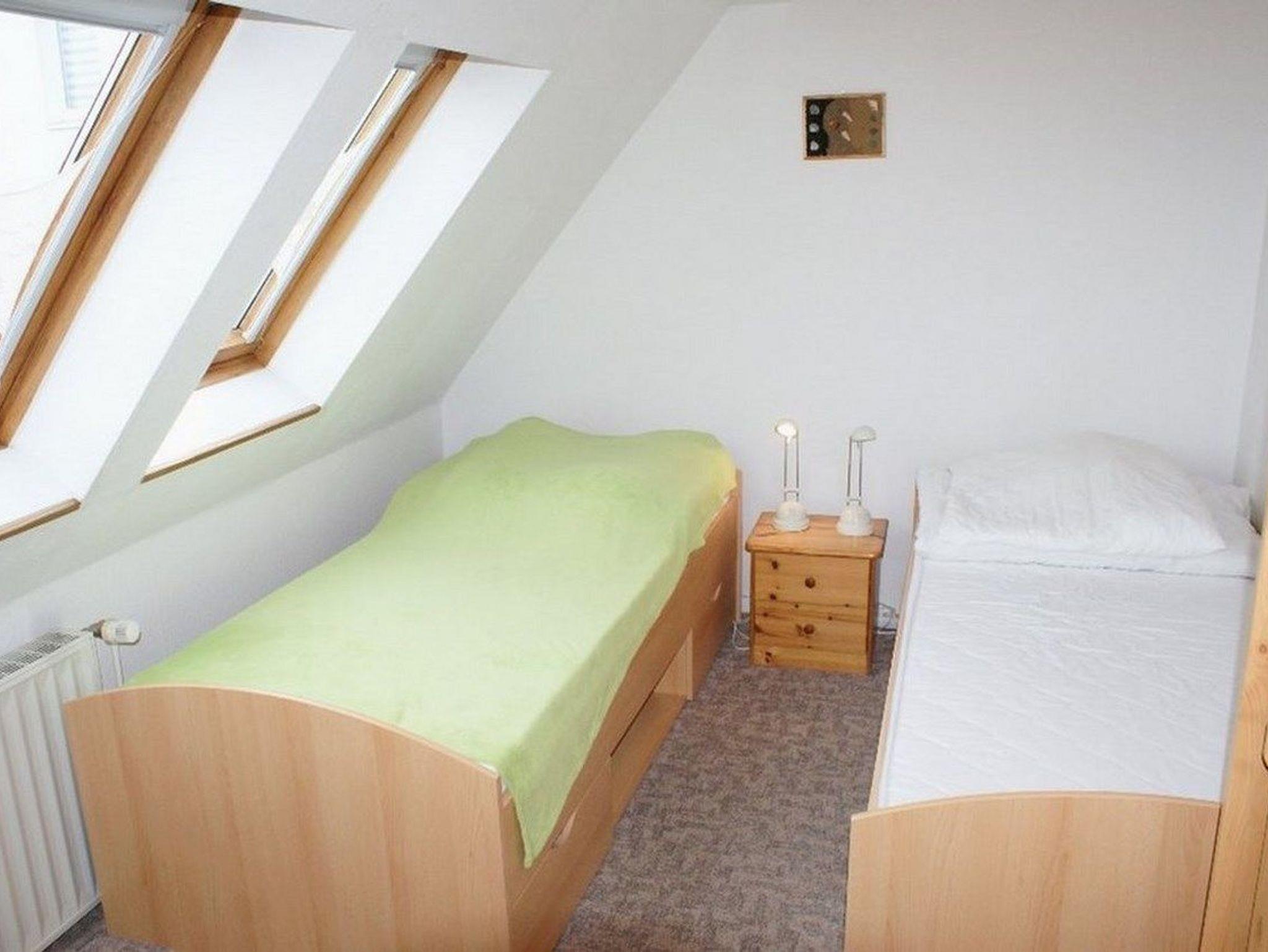- 1. Schlafzimmer im Erdgeschoss mit 2 Einzelbetten und einem Kleiderschrank. Bei Bedarf kann hier zusätzlich ein Kinderbett aufgestellt werden.