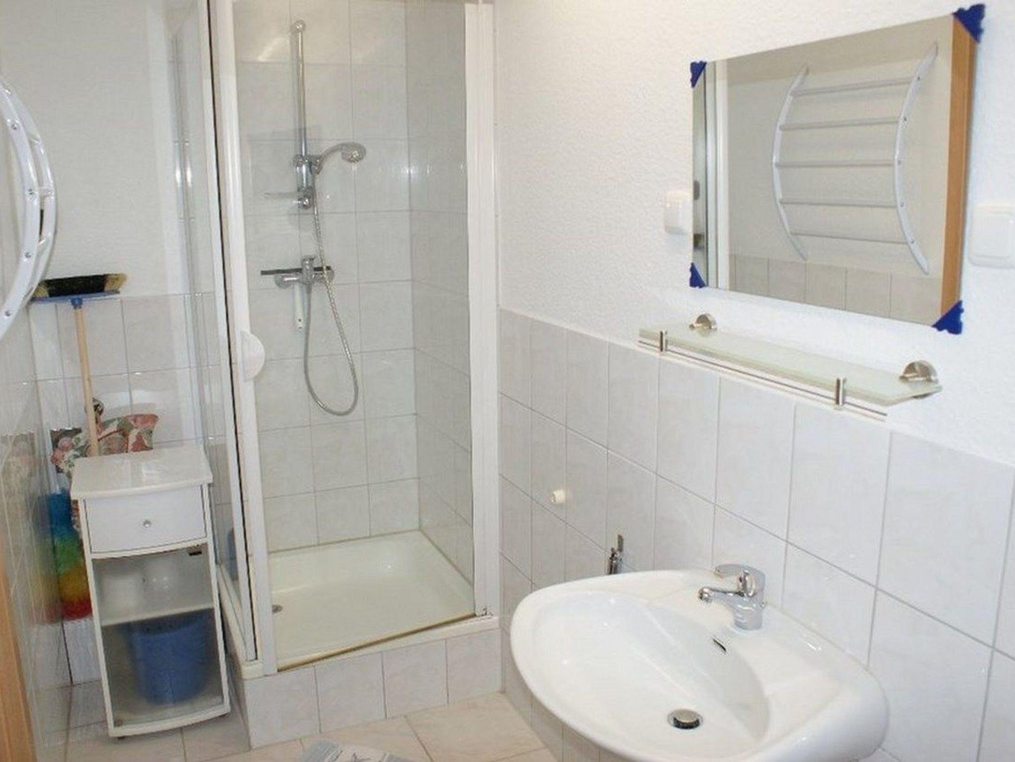 - Badezimmer mit Dusche, Waschbecken, Spiegel und WC
