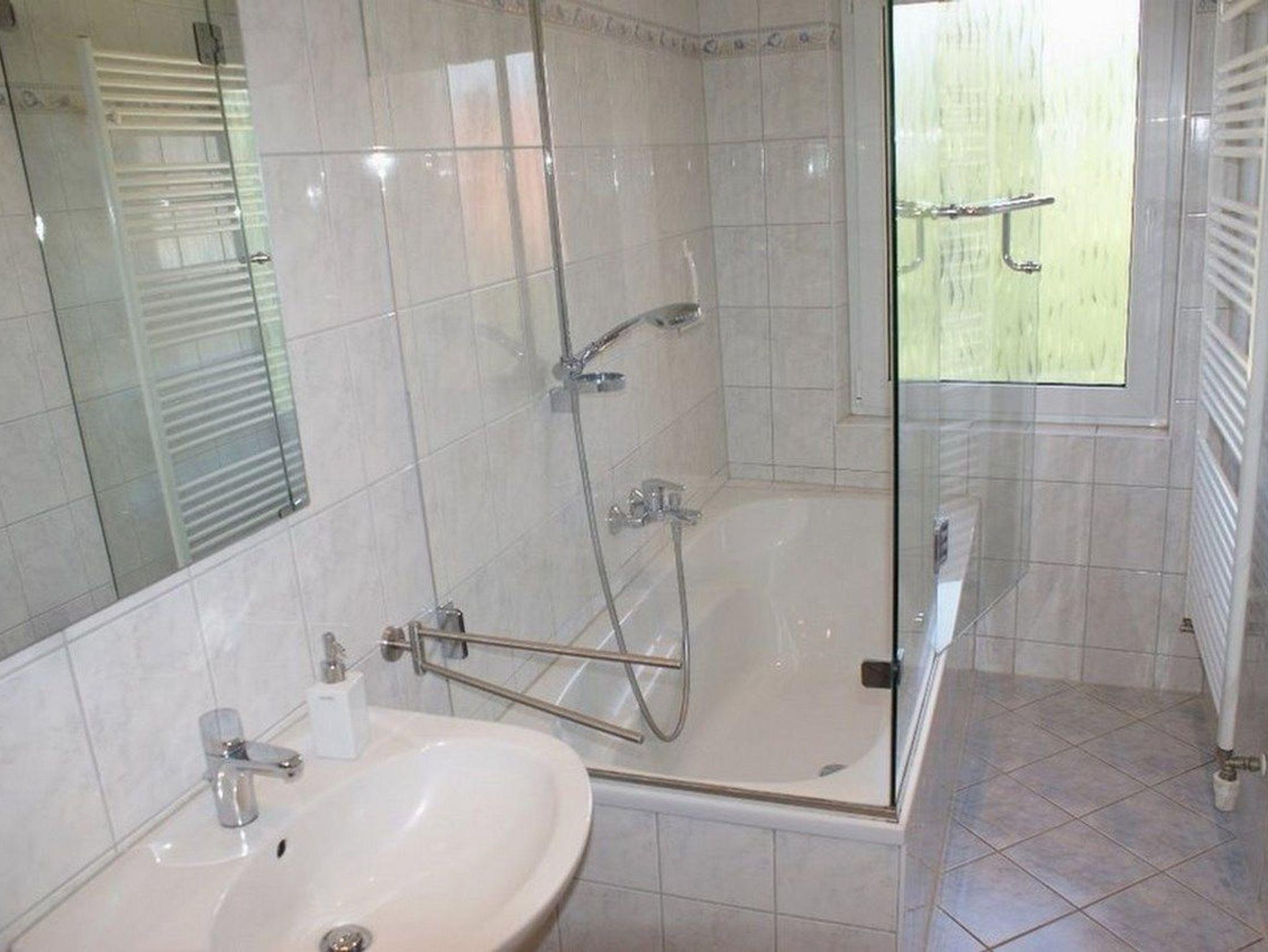 - Badezimmer mit Badewanne (Duschfunktion), WC, Spiegel