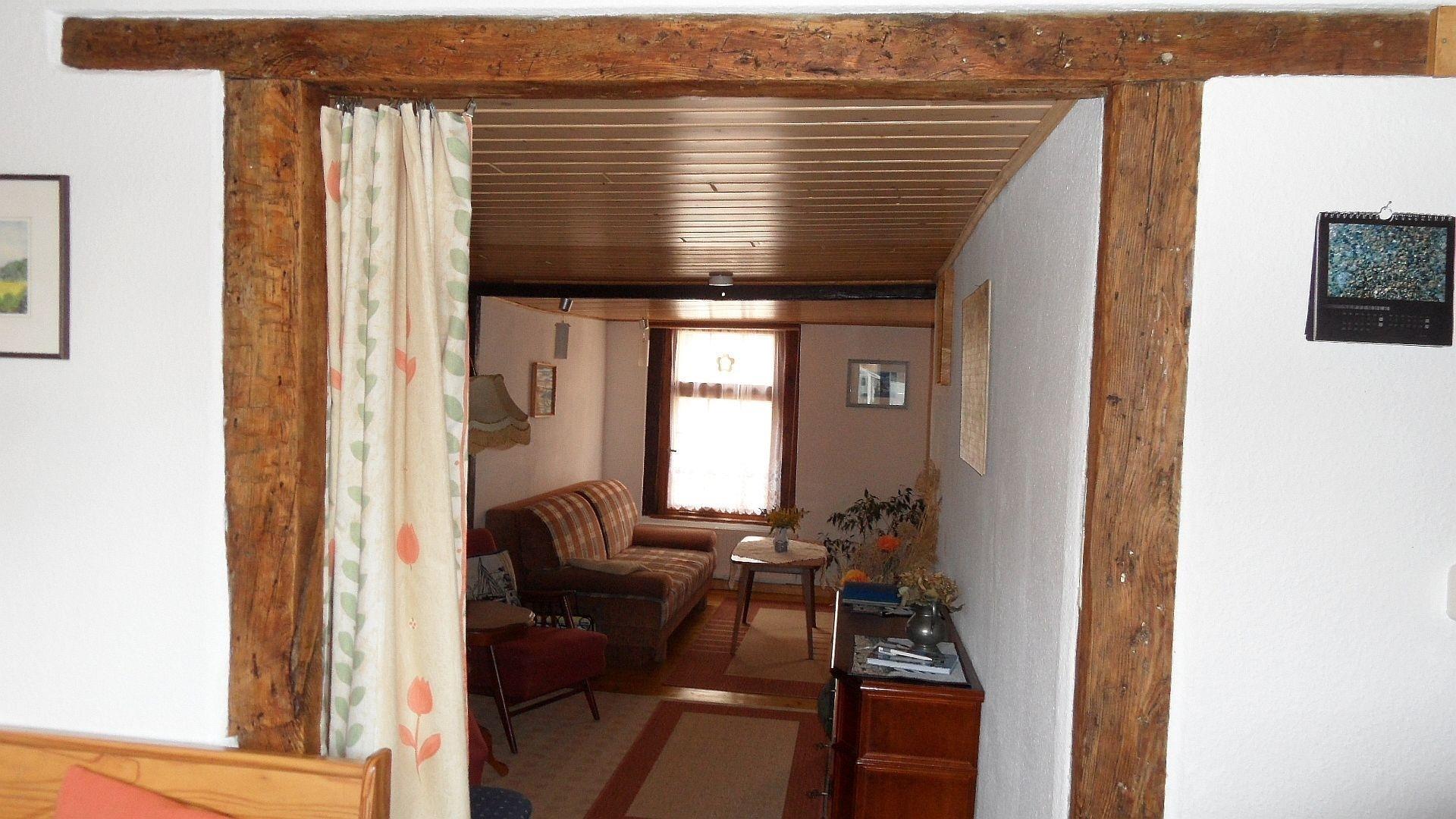 Von der Küche aus gelangen Sie in das L-förmige Wohnzimmer. Das ehemalige Alkovenzimmer mit der heimeligen Leseecke geht unmittelbar in das Wohnzimmer mit dem bequemen Sofa und dem behaglichen Schaukelstuhl im Fernsehbereich über.