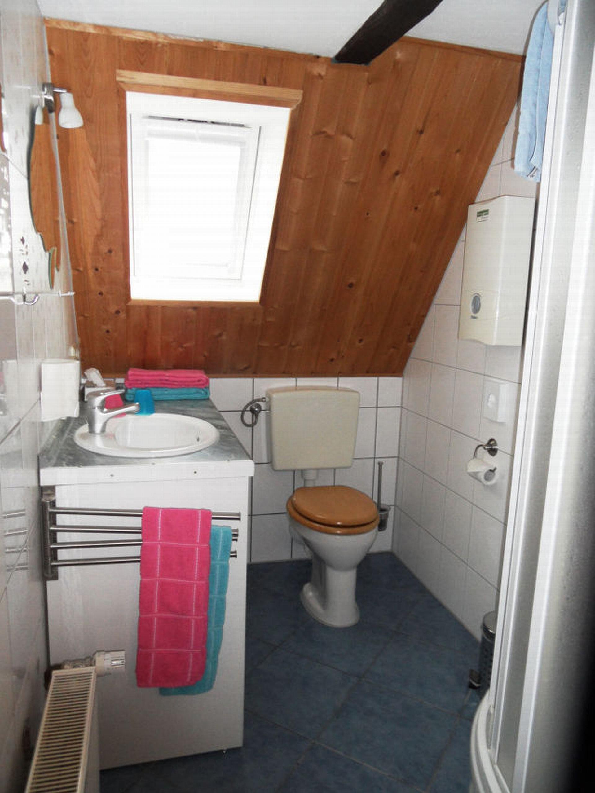 Das Duschbad/WC im Dachgeschoss macht die Oberwohnung komplett.