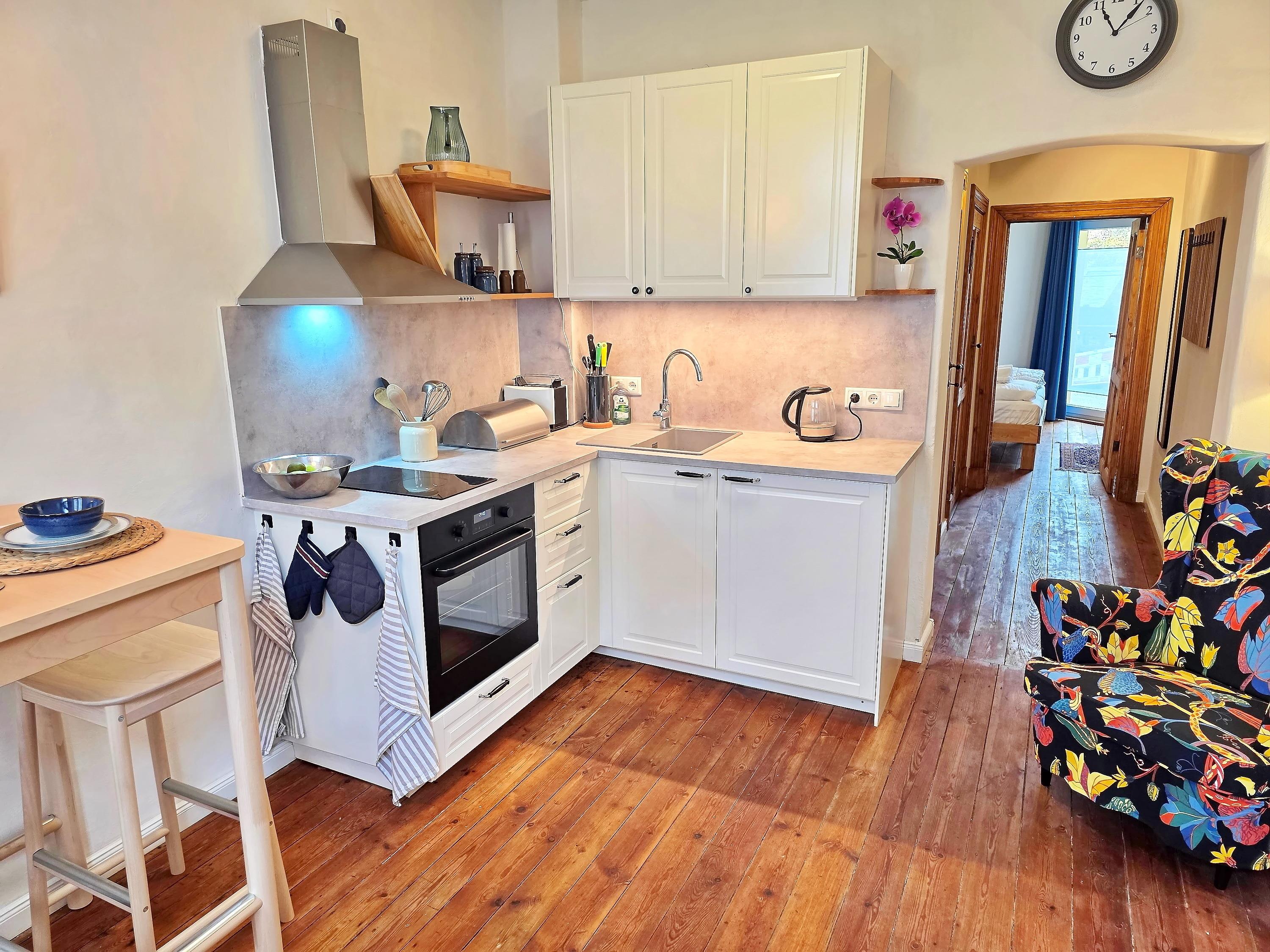 - Die offene Küche ist vollständig ausgestattet: Backofen, Kühlschrank, Wasserkocher, Kaffeemaschine, Toaster, Geschirr, Besteck und Küchenutensilien – alles da, um sich rundum selbst zu versorgen.