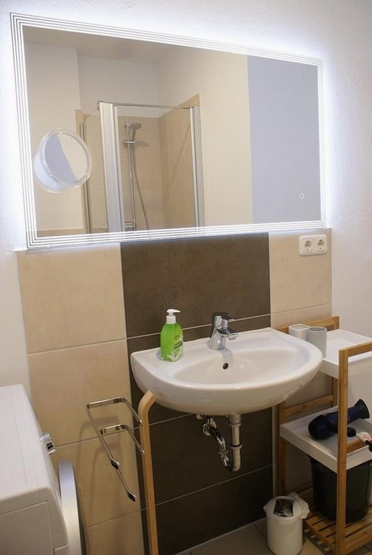 - Vollbad mit Badewanne, Dusche, WC, Spiegel, Kosmetikspiegel und Ablage