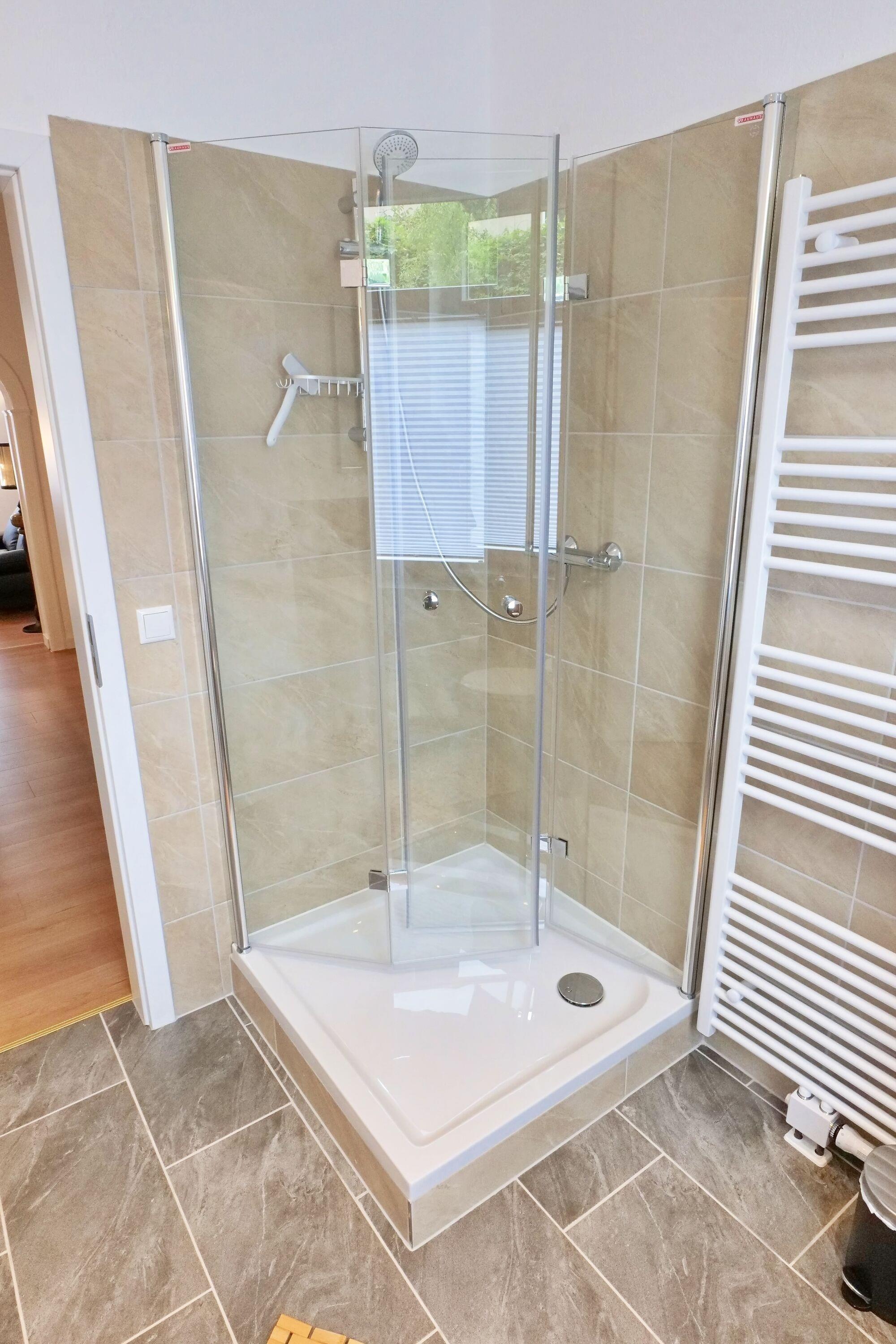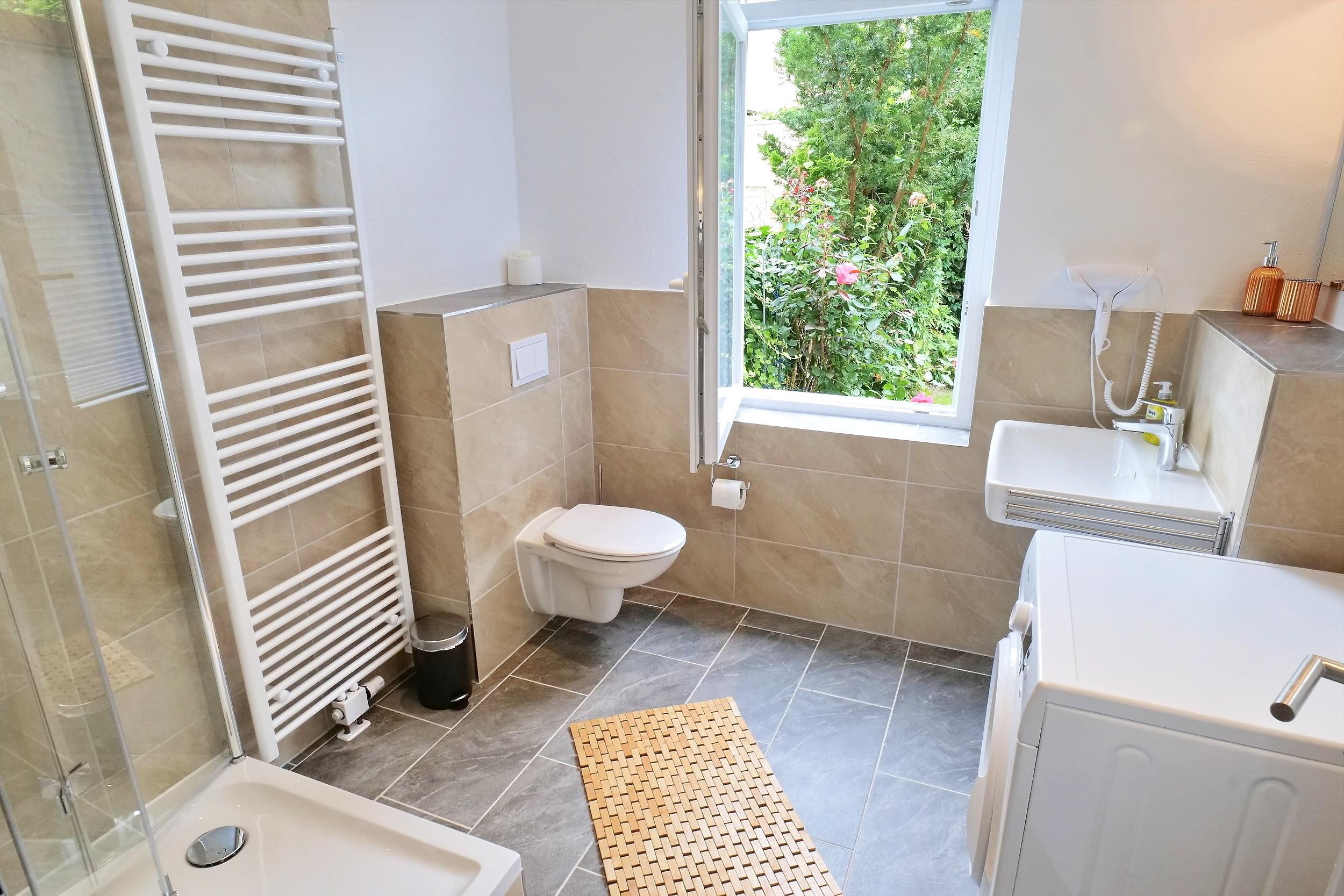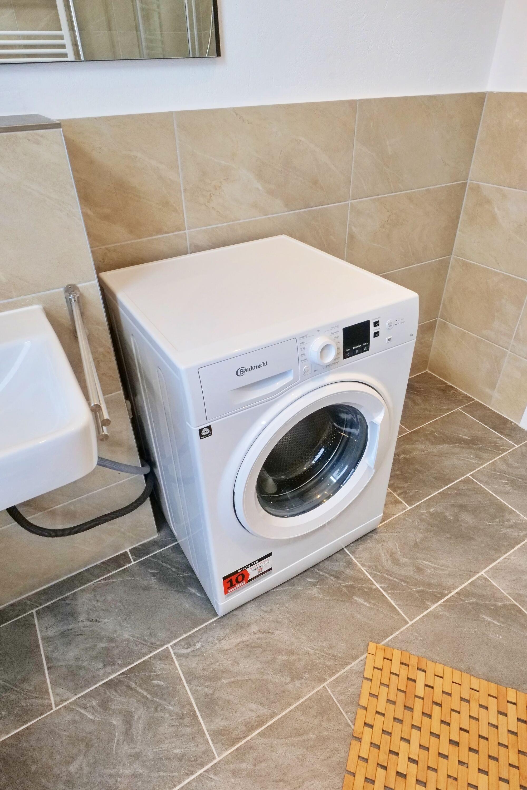 - Duschbad mit Dusche, WC, Spiegel, Ablage und Waschmaschine