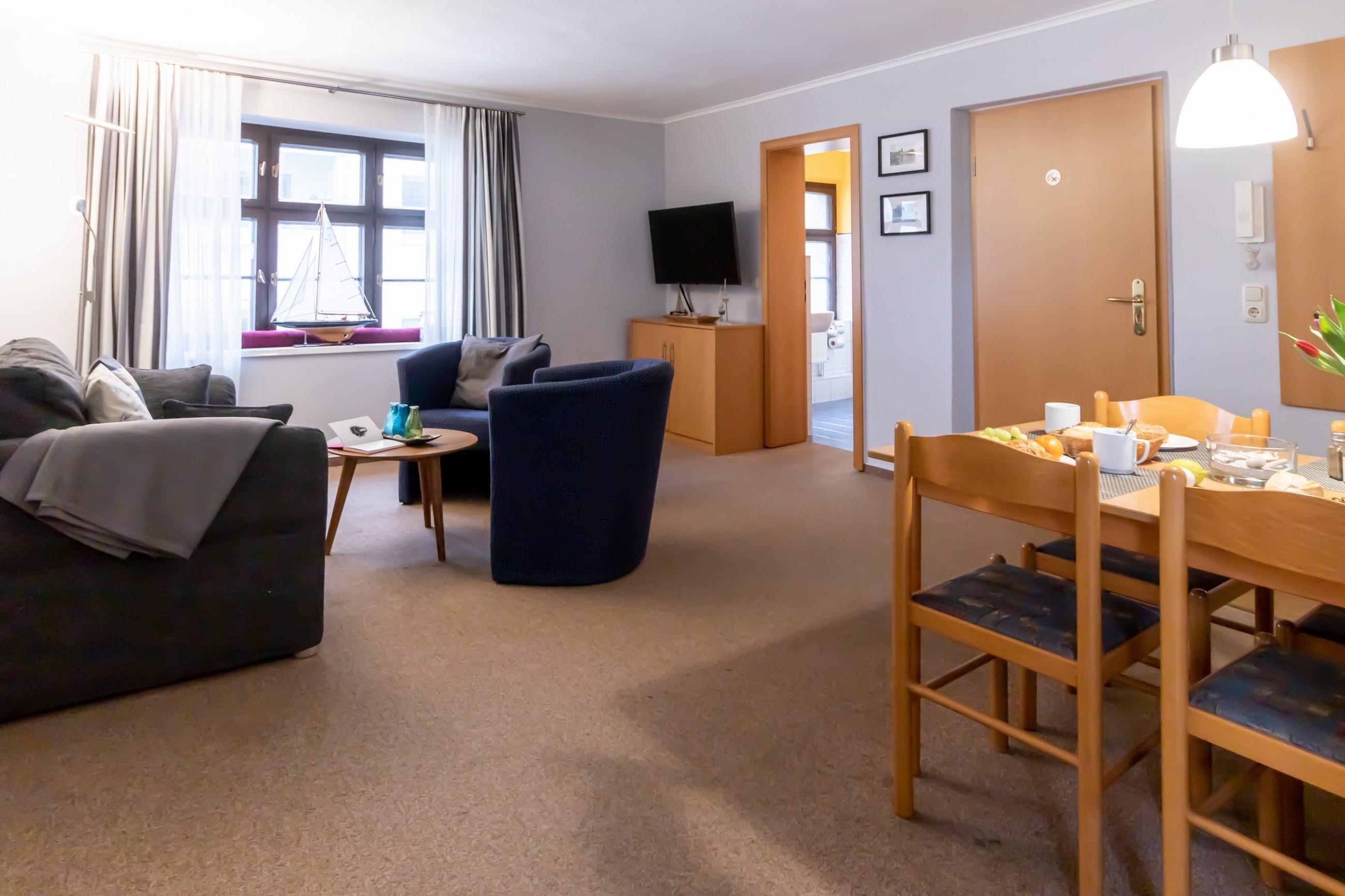 Wohnzimmer mit Schlafcouch, gemütliche Sitzecke, Essplatz, Flachbild-TV, Sat-TV