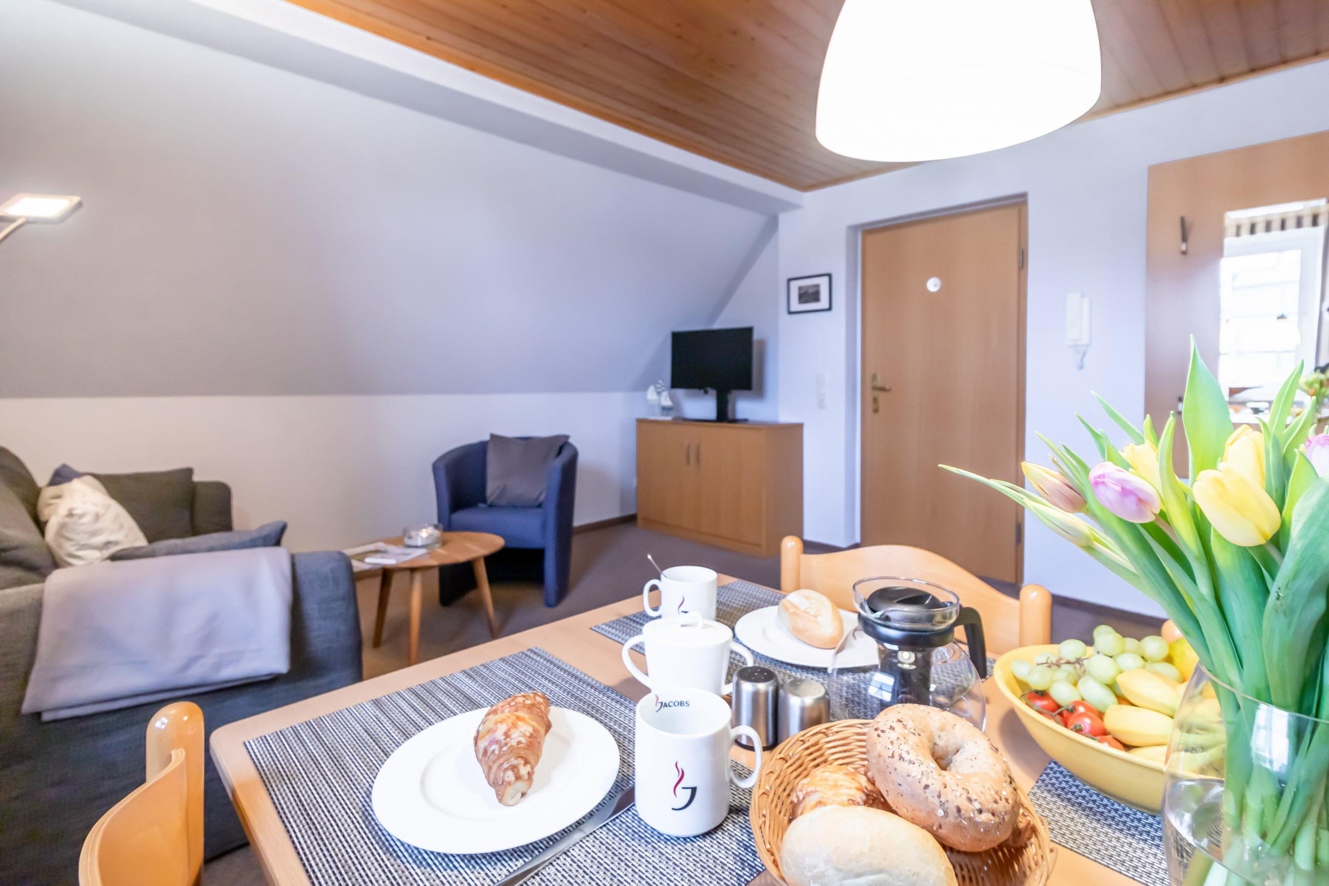 Wohnzimmer mit Schlafcouch, gemütliche Sitzecke, Essplatz, Flachbild-TV, Sat-TV