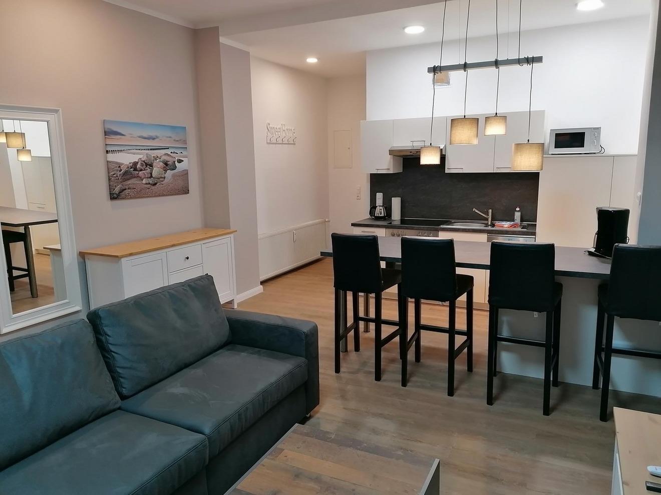 - offene Küche vollausgestattet u.a. mit Geschirrspüler, Backofen, Ceranfeld, Mikrowelle, Kaffeemaschine, Geschirr, Besteck, Gläser, Kühlschrank uvm.