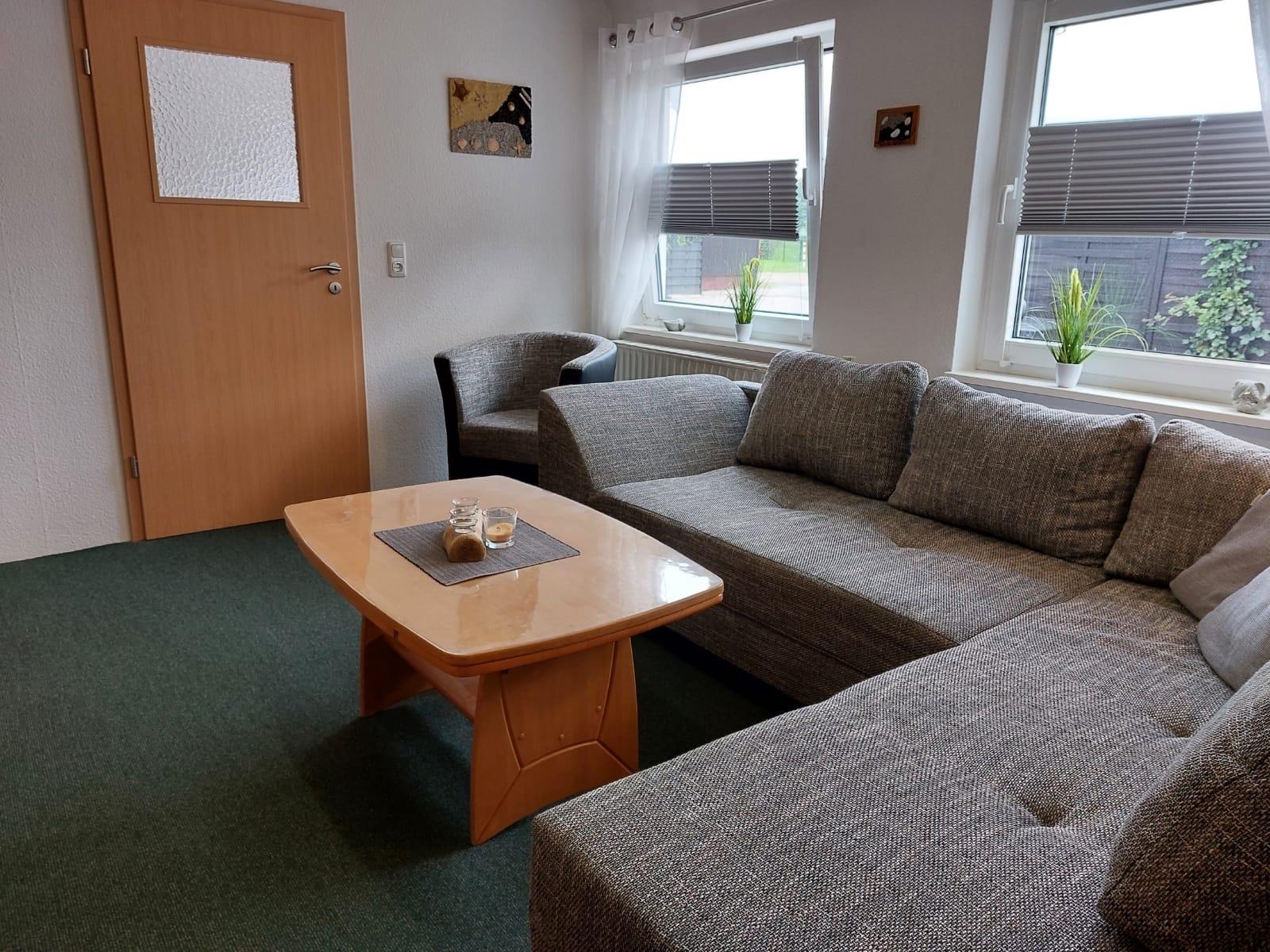 - Wohnzimmer mit Sitzgruppe bestehend aus Sessel, Tisch sowie Schrankwand, sowie TV über Sat- Anlage, DVD Player und Radio