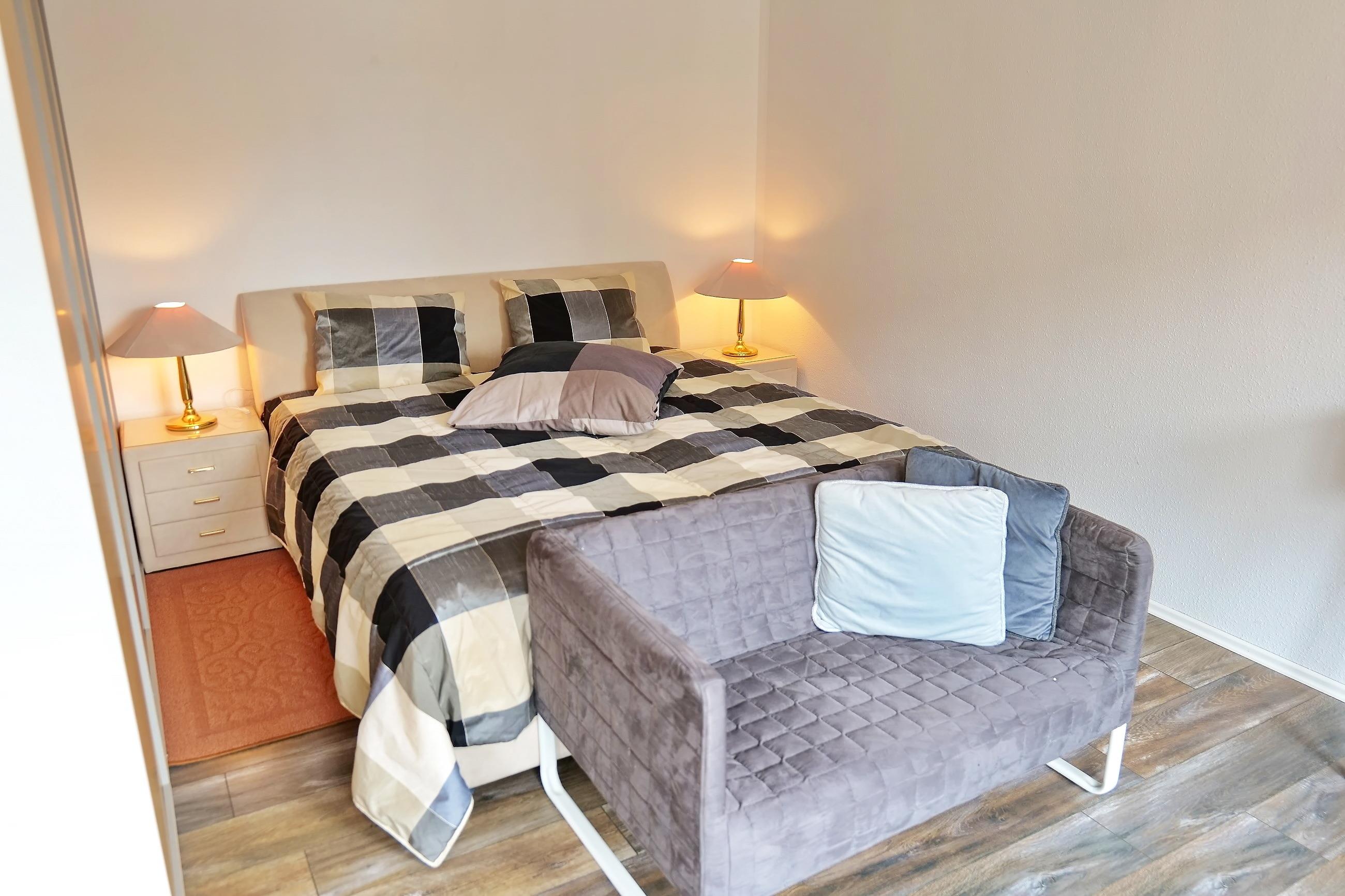 • 1 Wohn-/ Schlafzimmer für 2-3 Personen mit Doppelbett (1,80 x 2,00 m, abgetrennter Sichtbereich), Einzelbett, Couch (ausziehbar zur Schlafcouch), Tisch, Schlafsessel, Anbauwand