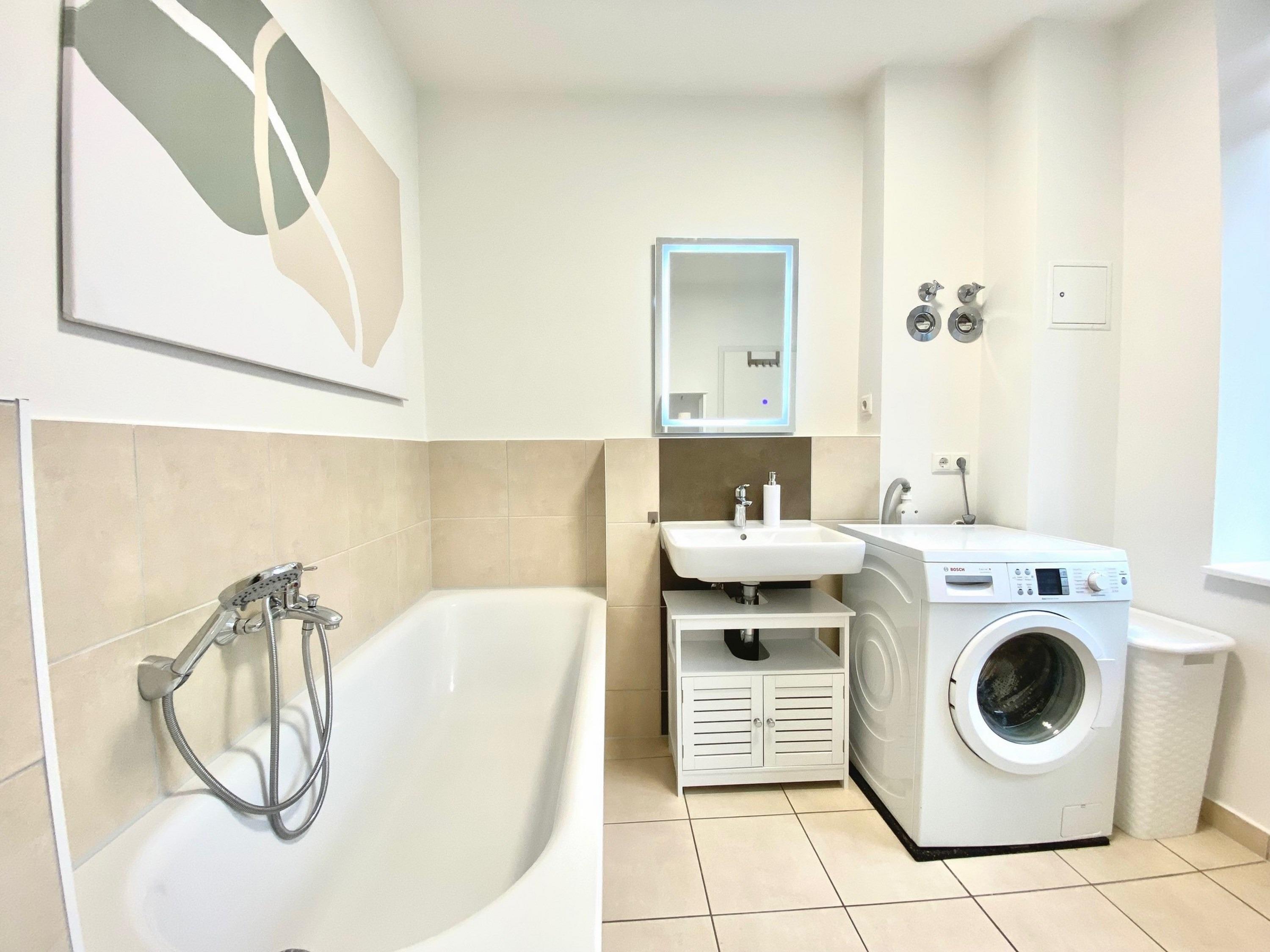 - Vollbad mit Badewanne, WC, Waschmaschine, Spiegel und Ablage, Wäscheständer