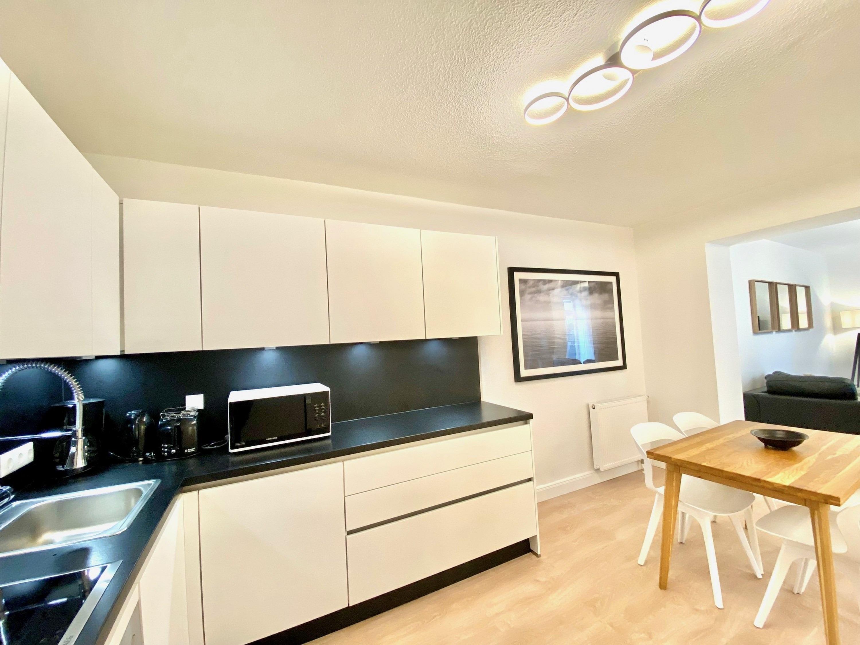 - offene Küche vollausgestattet u.a. mit Geschirrspüler, Backofen, Induktionsherd, Filter-Kaffeemaschine, zusätzliche Nespresso-Kaffeemaschine, Geschirr, Besteck, Gläser, Kühlschrank mit Gefrierteil