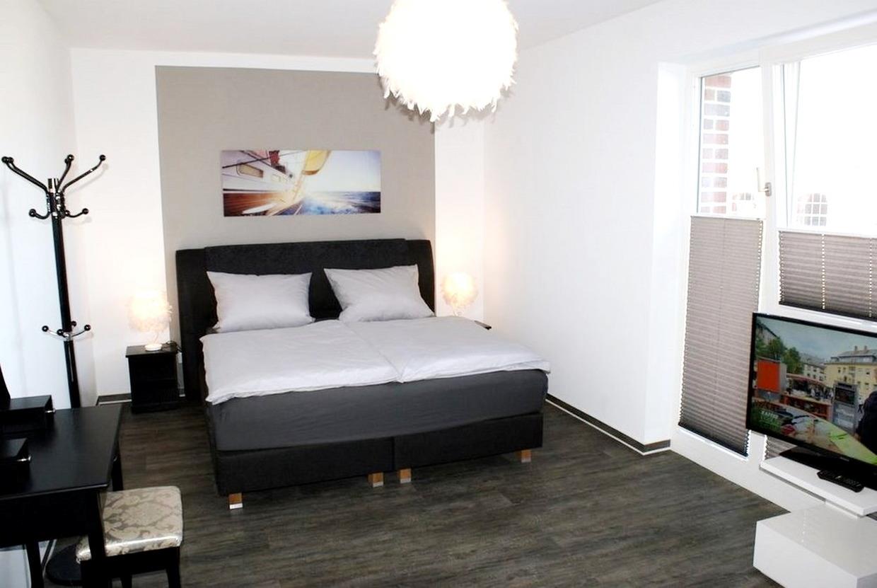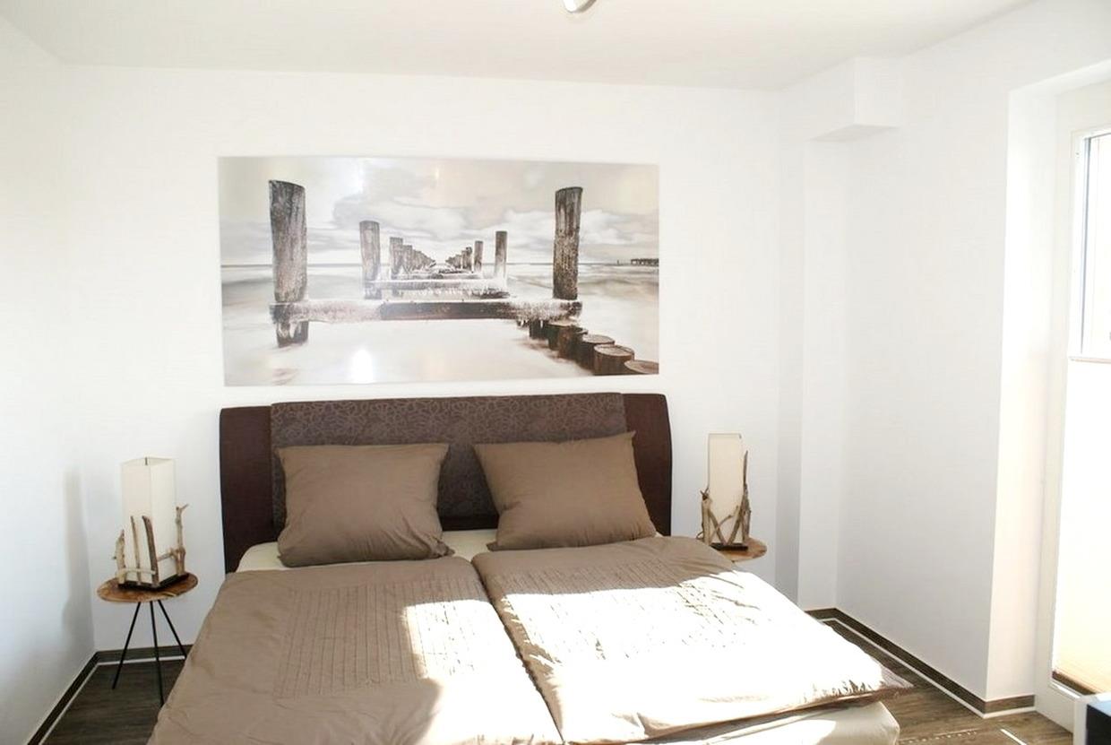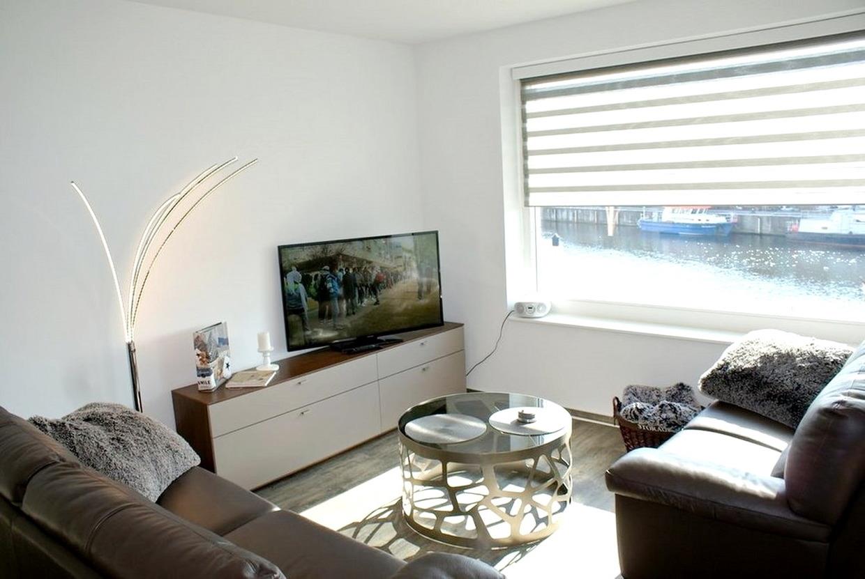 Unsere Ferienwohnung *Hafenblick* ist 84qm groß und bietet Platz für 2 bis 6 Personen. Sie ist modern und gemütlich mit viel Liebe zum Detail eingerichtet. Das Wohnzimmer mit offener Küche, sowie einer Loggia mit Blick auf den Hafen laden zum morgendlichen Frühstück oder zum Abend ausklingen bei einem Gläschen Wein ein. Entspannen Sie auf der Couch, sitzen Sie unterhaltsam am großen Esstisch oder beobachten Sie von der Loggia aus Treiben an der Kaikante. Die Ferienwohnung besitzt zwei separate Schlafzimmer. Im Kleineren der zwei Schlafzimmer befindet sich ein gemütliches Doppelbett und im Großen ein Doppelbett, sowie ein weiteres Ausziehbett. Die hochwertige Ausstattung runden zwei Fernseher und kostenloses Internet über WLAN für Sie ab.