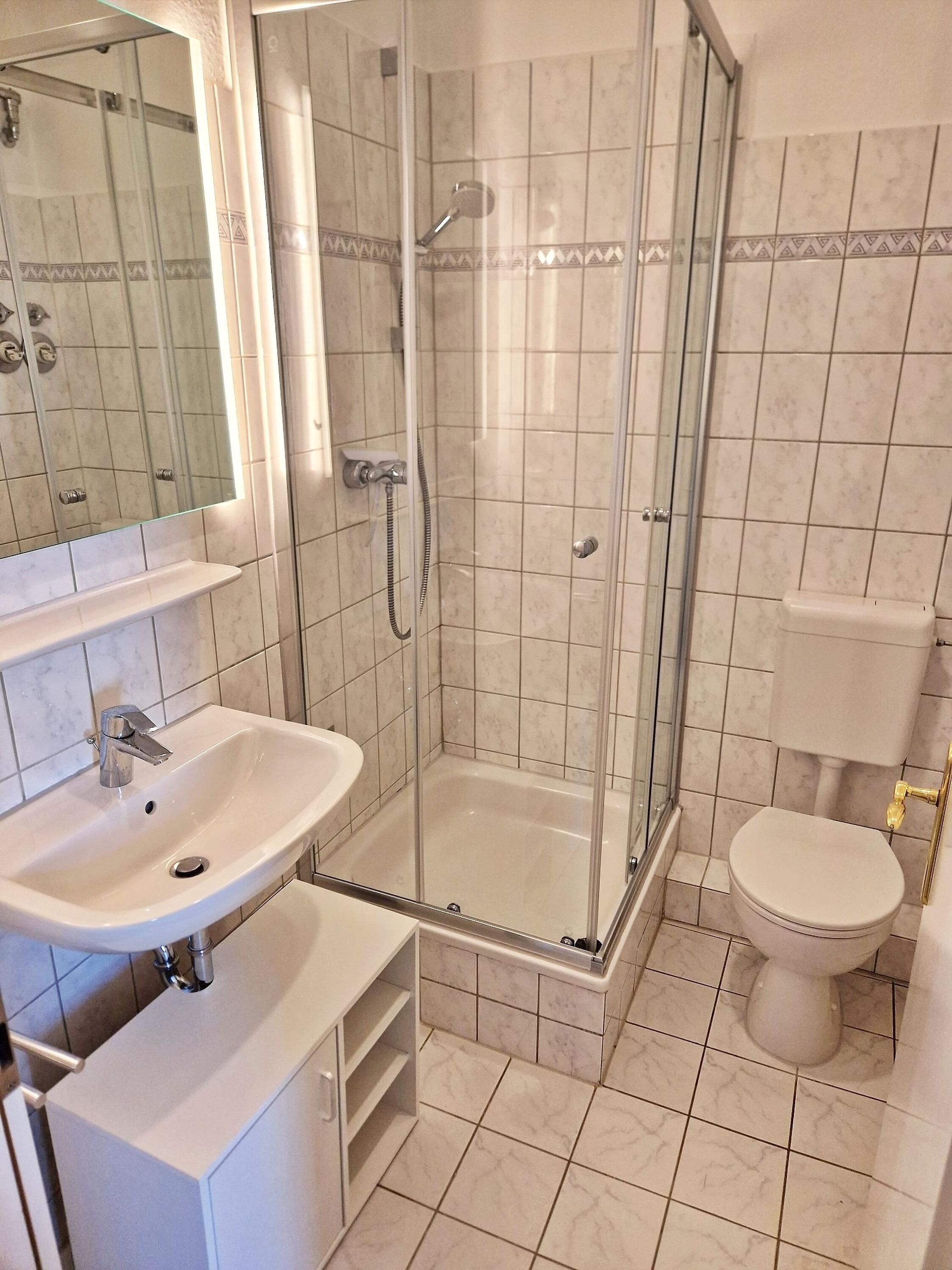 - Badezimmer mit Dusche/WC, Spiegel, Waschmaschine, Spiegel und Ablage, Wäscheständer
