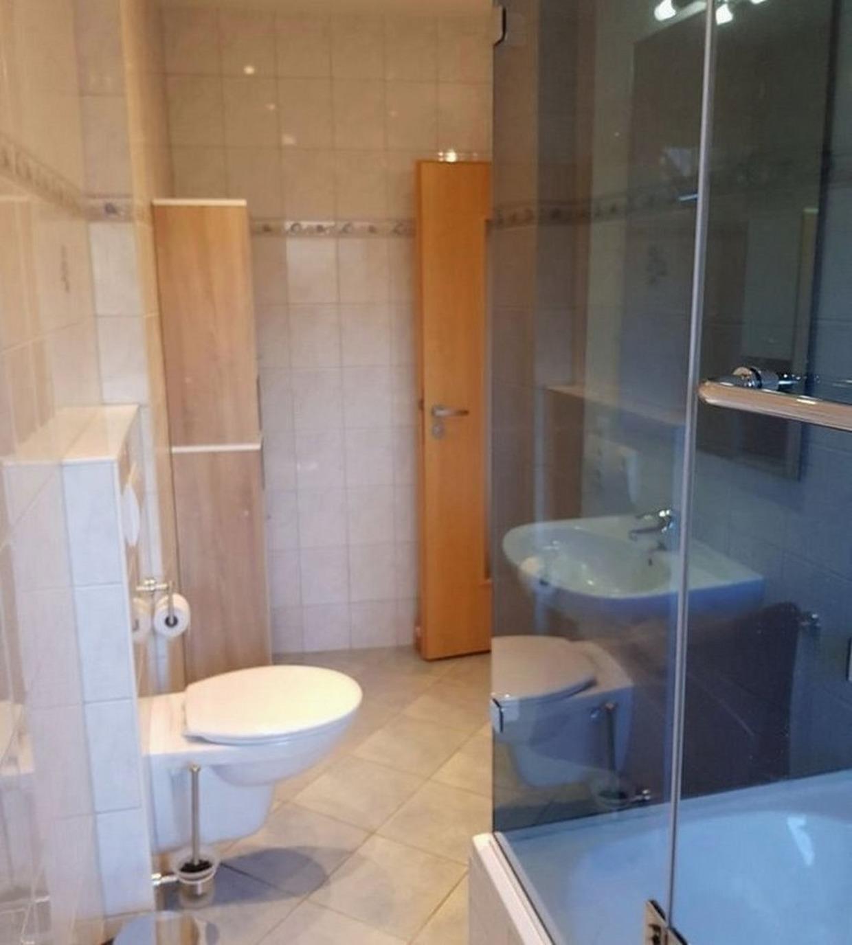 - Badezimmer mit Badewanne (Duschfunktion), WC, Spiegel