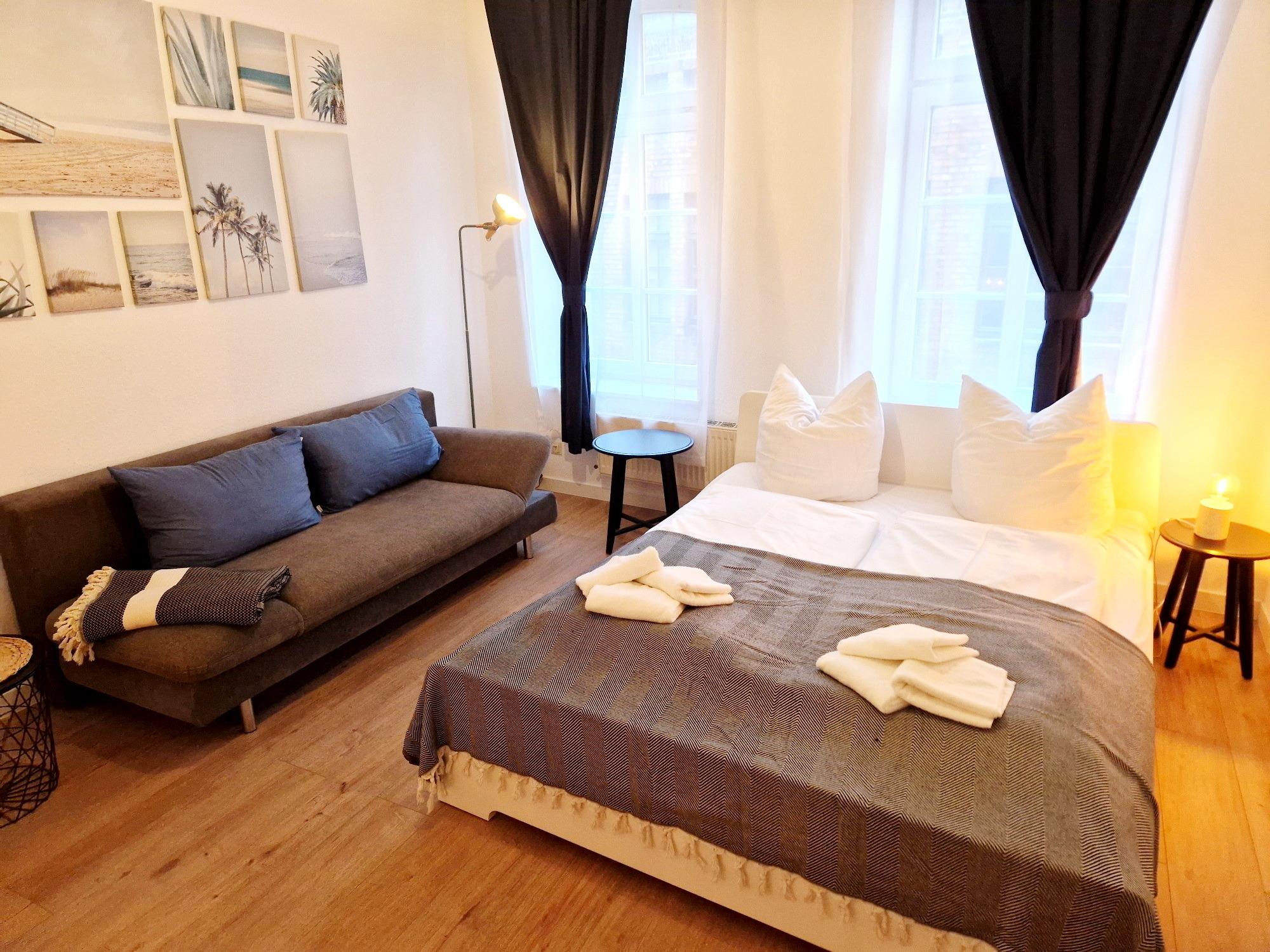 - 1 Wohn-/Schlafzimmer mit Doppelbett (1,60 x 2,00 m), Sofa, Kommode, TV