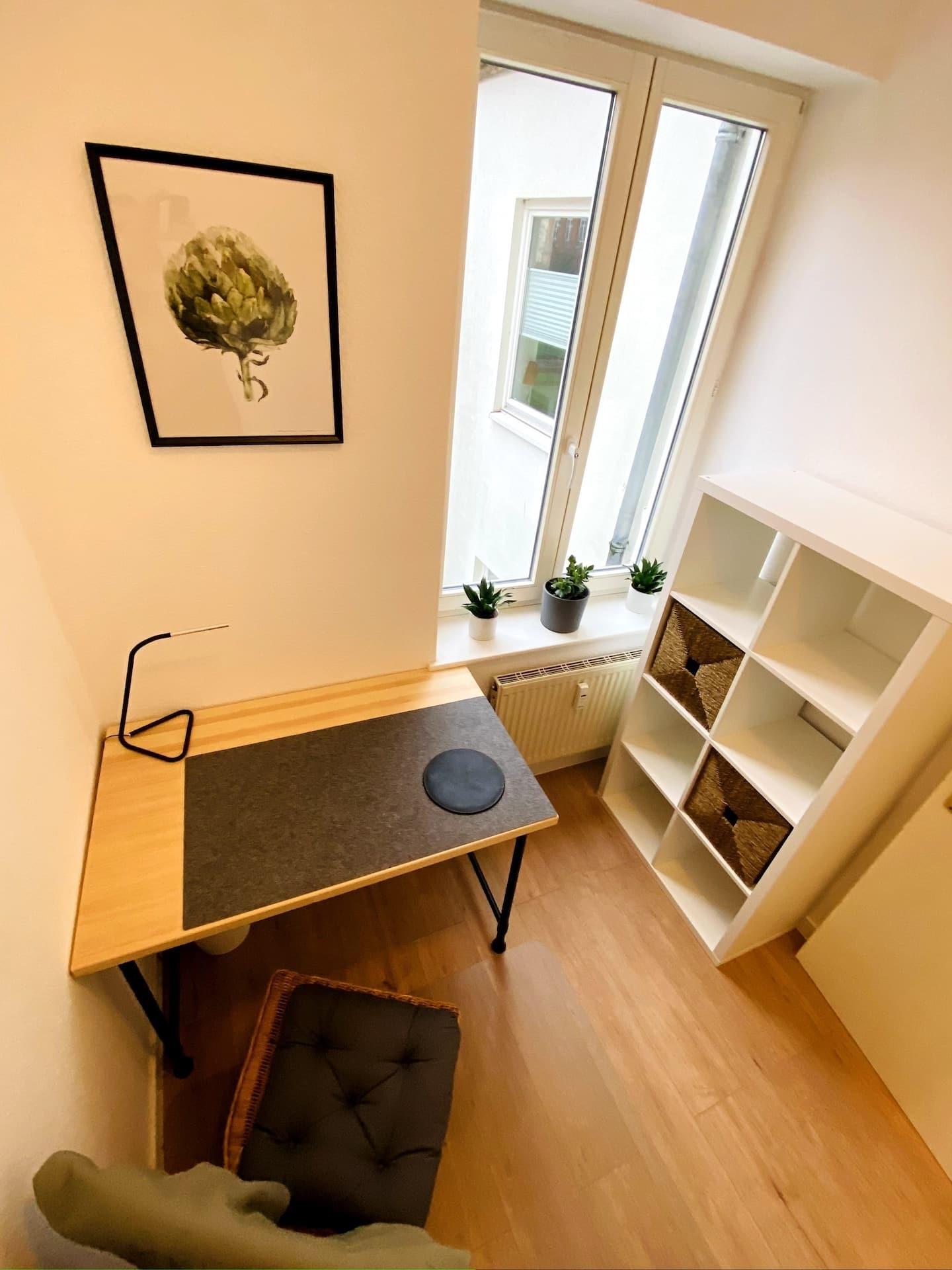 Auf knapp 40qm bietet es ein helles Wohn- und Schlafzimmer (Bett, Sofa, Kommode, TV) nach Westen mit zwei großen Altbaufenstern, ein Arbeitszimmer mit Schreibtisch [&] Bücherregal nach Osten mit Blick in einen grünen Innenhof, ein modernes Bad (Dusche, WC, Waschbecken, Waschmaschine und Wäscheständer) und eine voll ausgestattete Küche mit Spüle, Kühlschrank, Ofen, Ceranfeld-Herd und Essecke inkl. Töpfe, Teller, Geschirr, Besteck, Wasserkocher, Toaster, Espressomaschine, etc..