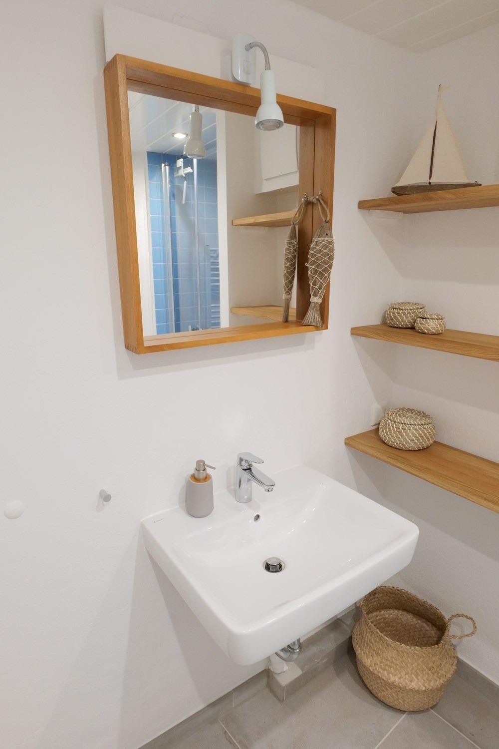 - Bad mit Dusche, Toilette, Waschbecken, Handtuchheizkörper