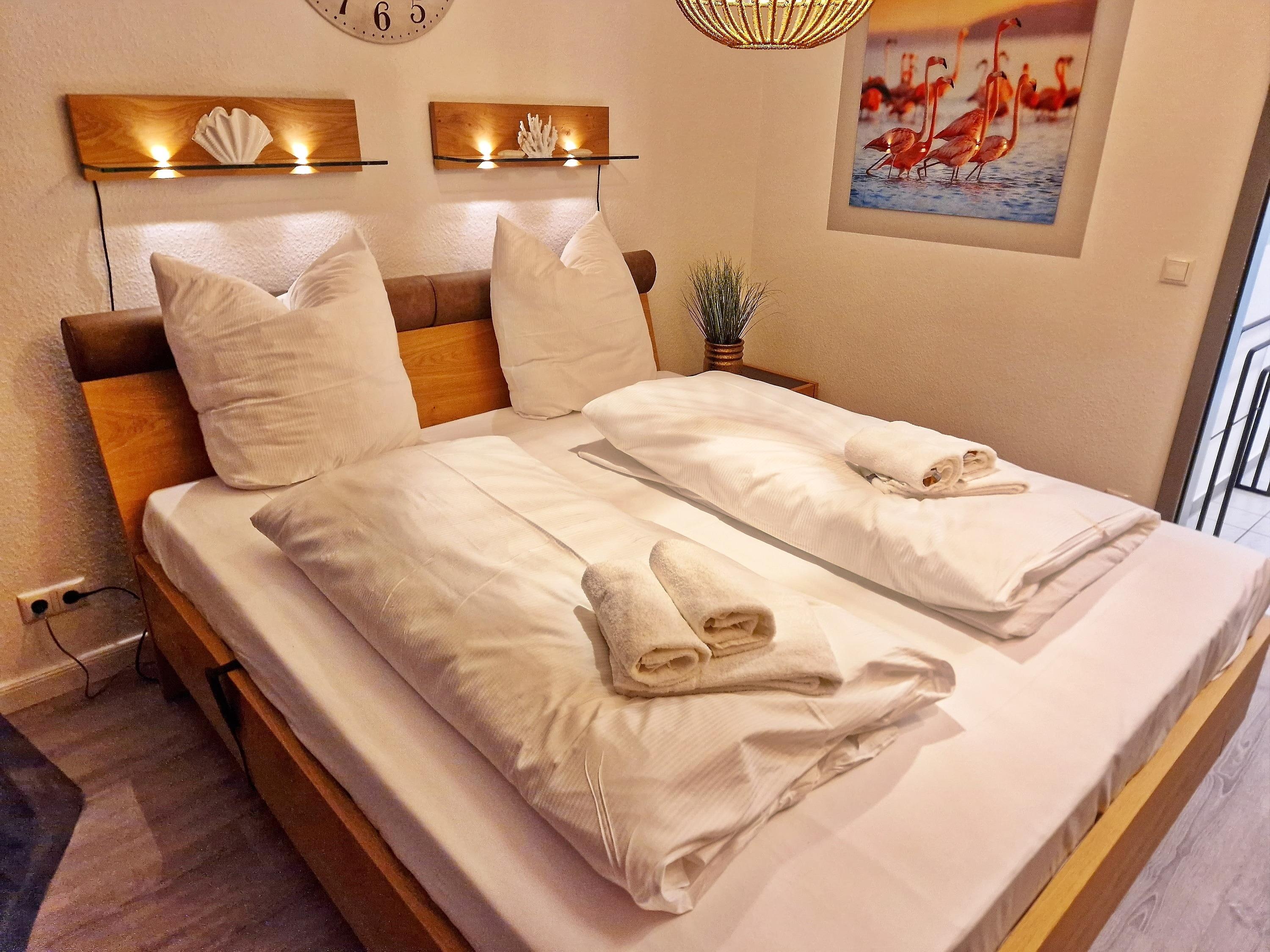 1 Schlafzimmer separat mit großem Doppelbett (1,80 x 2,00 m, höhenverstellbar), sowie ausreichend Stauraum für Ihre Kleidung. Hochwertige Biobettdecken und Kopfkissen allergikergeeignet.