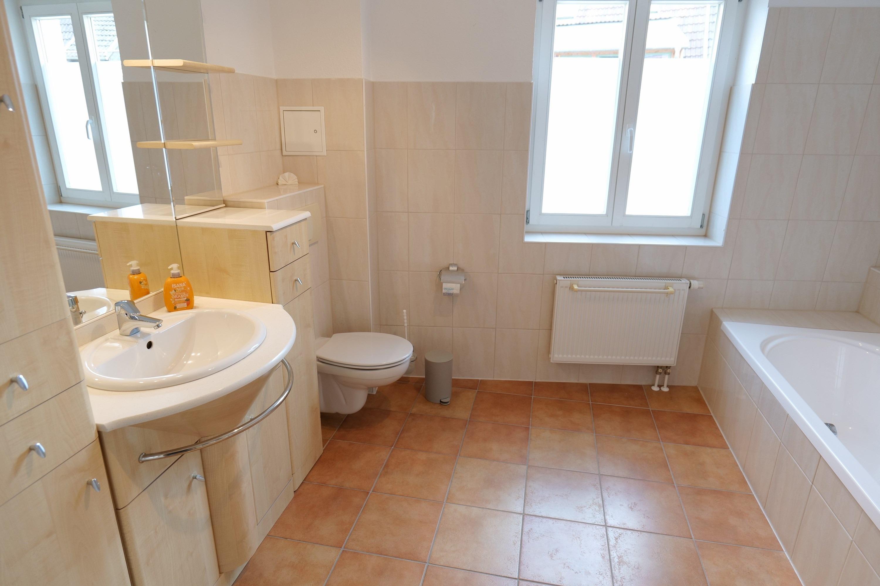 - 1. Badezimmer mit Badewanne, WC, Waschbecken, Spiegelschrank, Waschmaschine