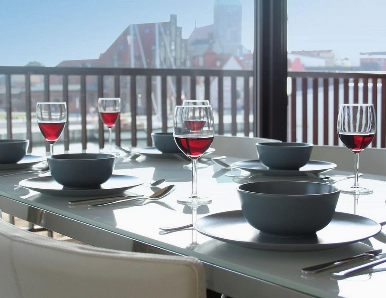 Das Wohnzimmer bietet mit seiner großzügigen Fensterfront einen Panoramablick auf den denkmalgeschützten 1862 erbauten Thormann-Speicher, auf das sogenannte Baumhaus, das seinen Namen dem Umstand verdankt, dass die Hafeneinfahrt früher des Nachts aus Sicherheitsgründen mit Hilfe eines quergelegten langen Baumstamms abgesperrt wurde und auf das Wassertor, dem letzten erhaltenen Stadttor Wismars.