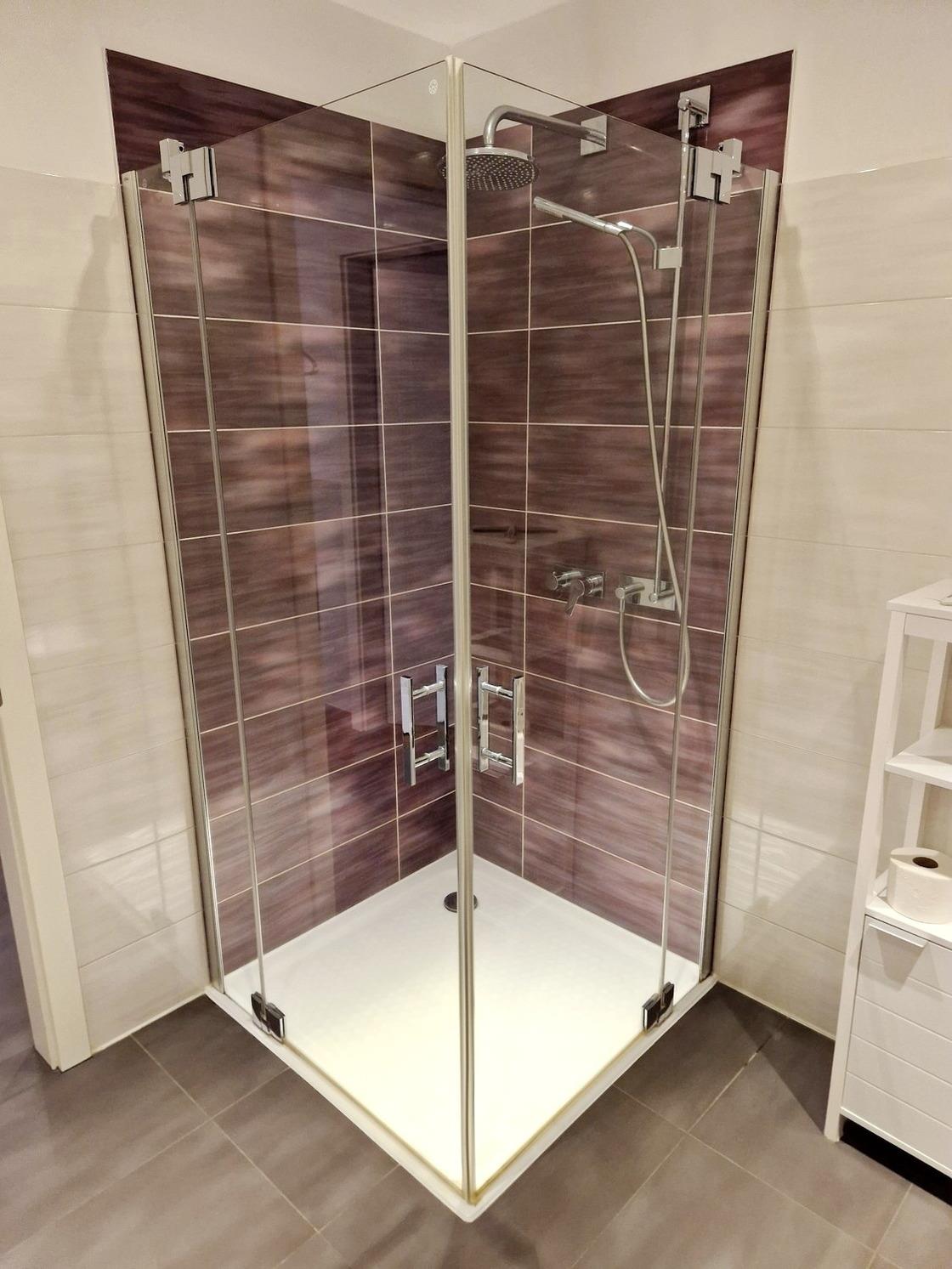 - Das Bad mit Abluftsystem verfügt über einen nahezu ebenerdigen Duschbereich 100x100 und thermostatgeregelter Duschbrause sowie Tropendusche, Handtuchtrockner und großem Spiegel