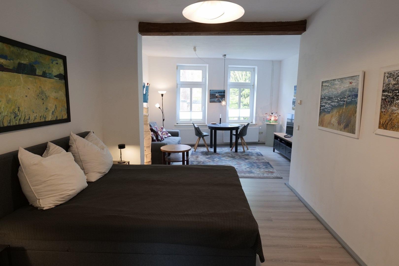 Die Wohnung ist mit allen Annehmlichkeiten und originellen Einzelmöbeln ausgestattet. An den Wänden hängen große und kleine Originalgemälde mit Wismar- und Ostseeassoziationen.