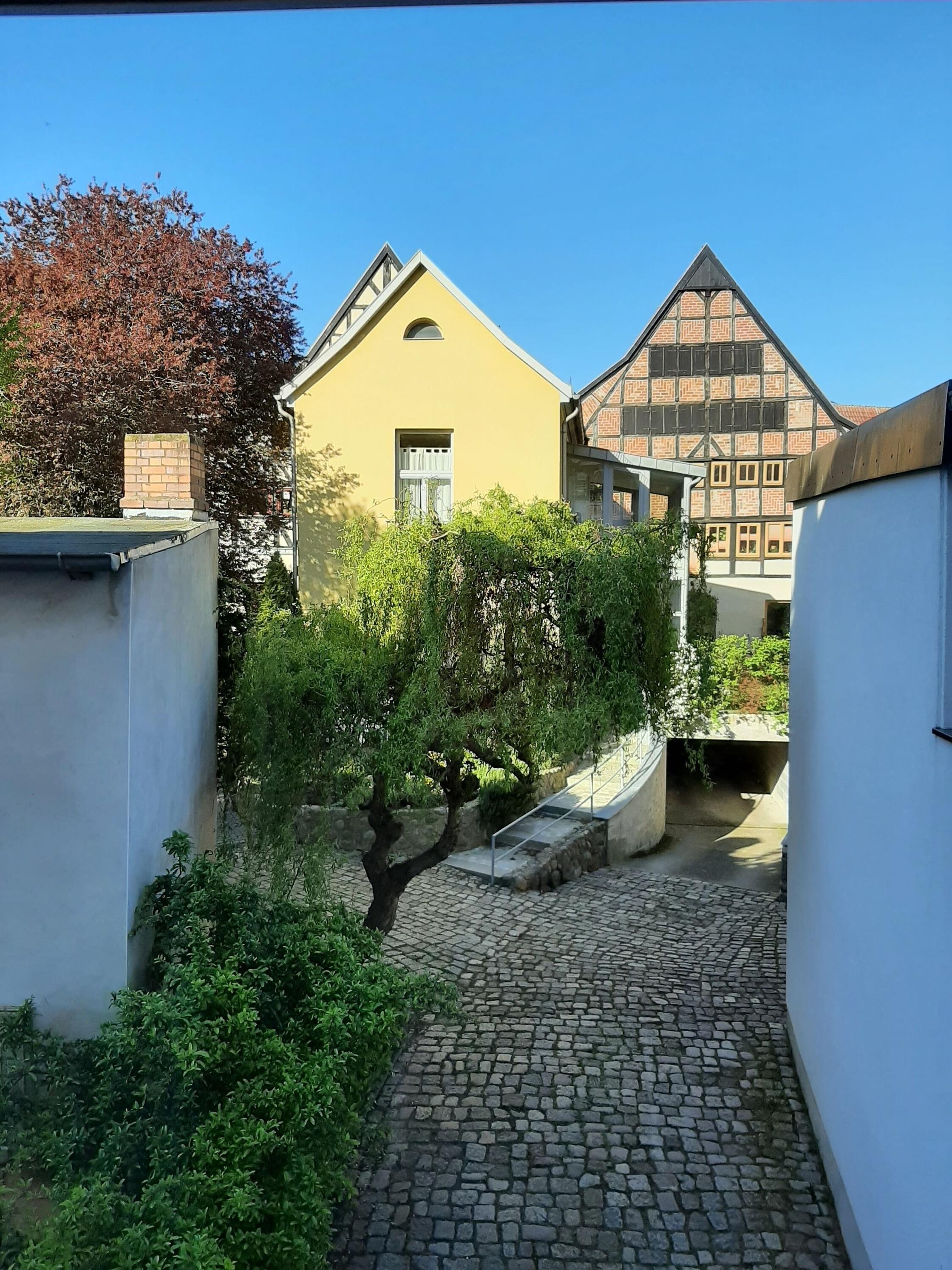 Das Fenster der Küche schaut auf einen der schönsten, aber vollkommen ruhigen Hof von Wismar mit zwei hanseatischen Prachtgiebeln.