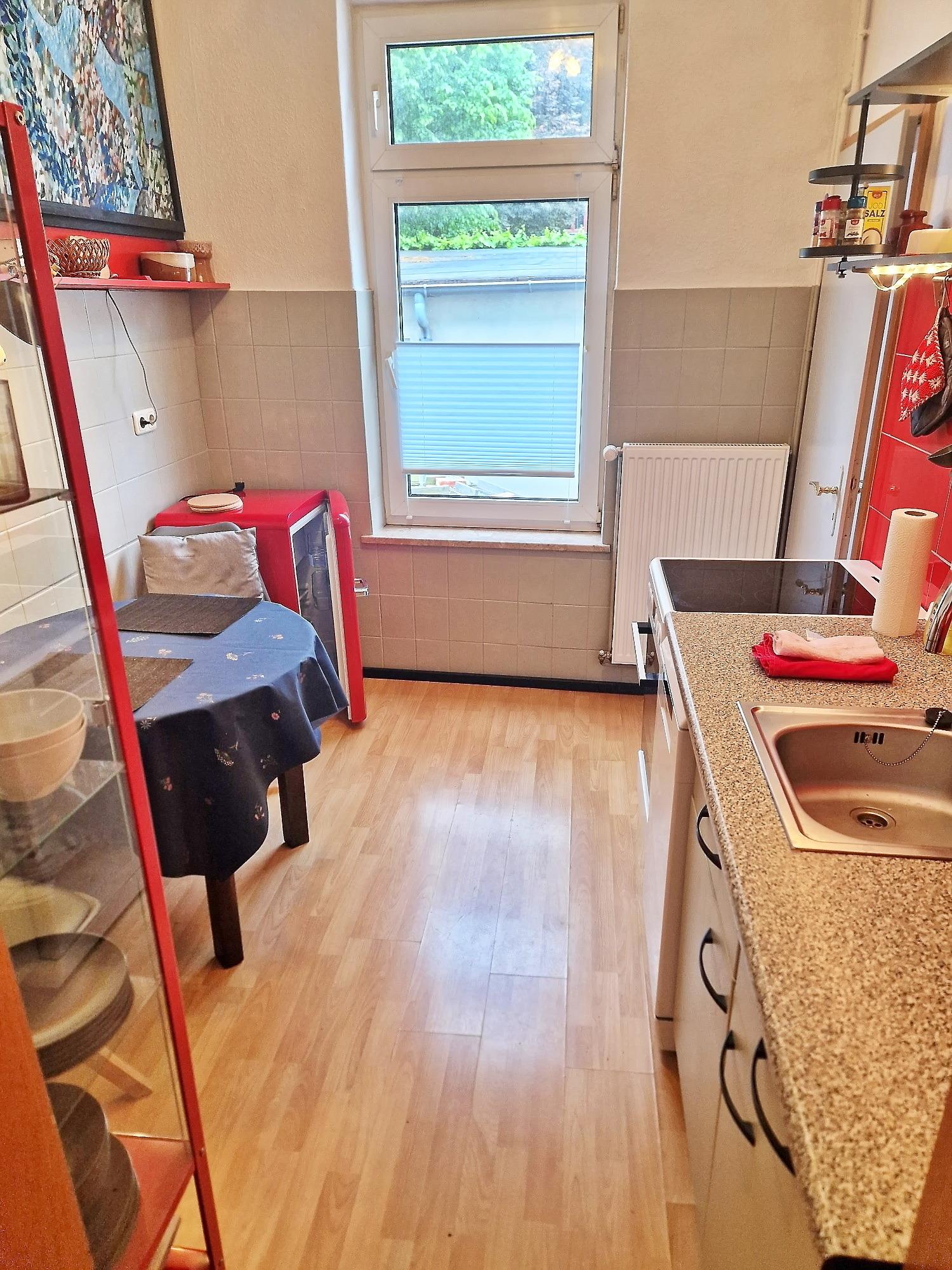 - Küche: Geschirrspüler, Backofen, Kochfeld, Kühlschrank, Kaffeemaschine, Wasserkocher, Geschirr- und Kochausstattung, kleiner Essplatz