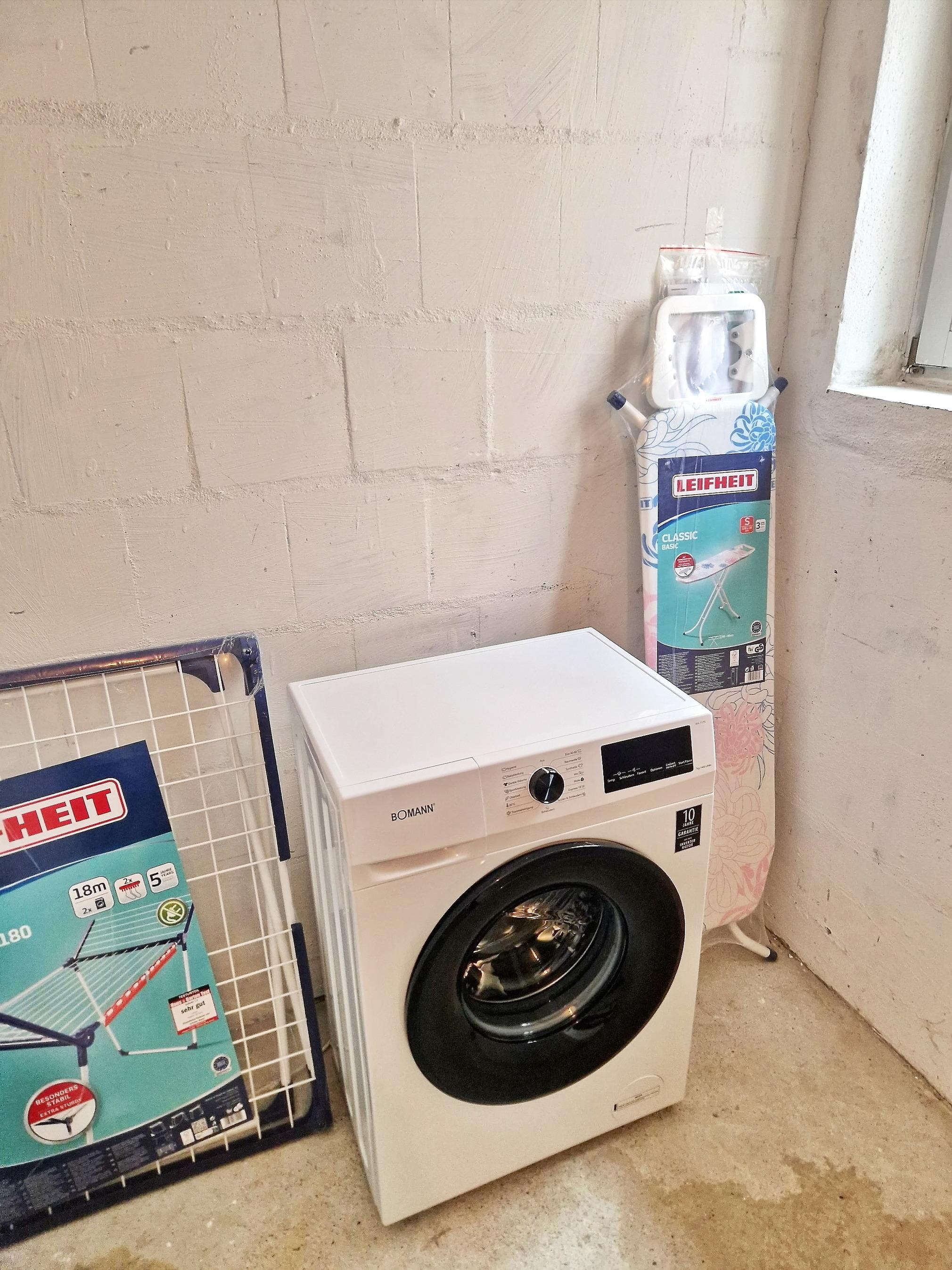 Waschmaschine und Wäscheständer im Waschmaschinenraum