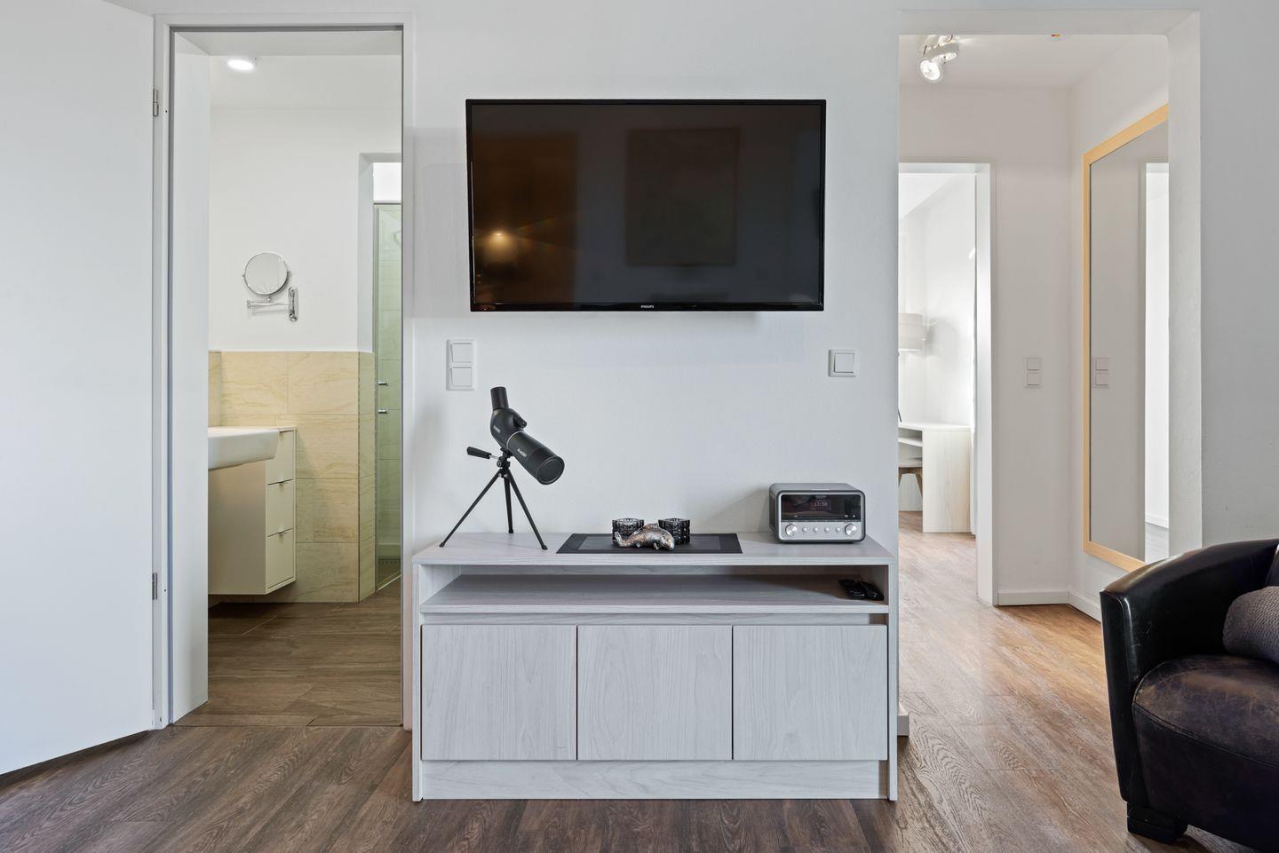 Das lichtdurchflutete und barrierearme Apartment verfügt über bodentiefe Fenster und kostenfreies WLAN.