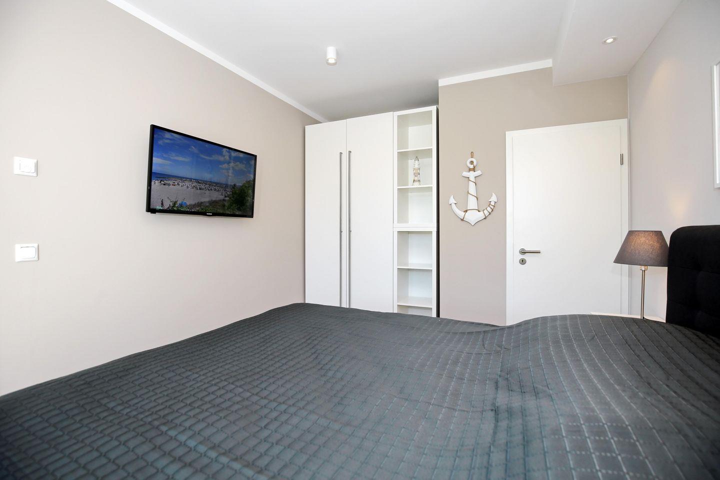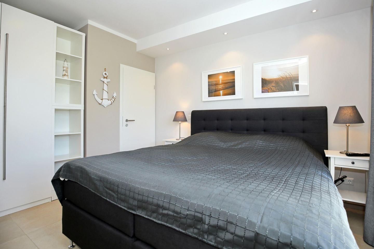 In den Doppelzimmern empfängt dich ein bequemes Boxspringbett mit einer Matratze (180 x 200 cm) zur erholsamen Nachtruhe. Ein großer Kleiderschrank und Nachttische bieten genügend Stauraum für dein Urlaubsgepäck. Ein Flatscreen-TV sorgt für spätabendliche Unterhaltung. Plissees dienen im Esszimmer und Badezimmer als Sichtschutz.