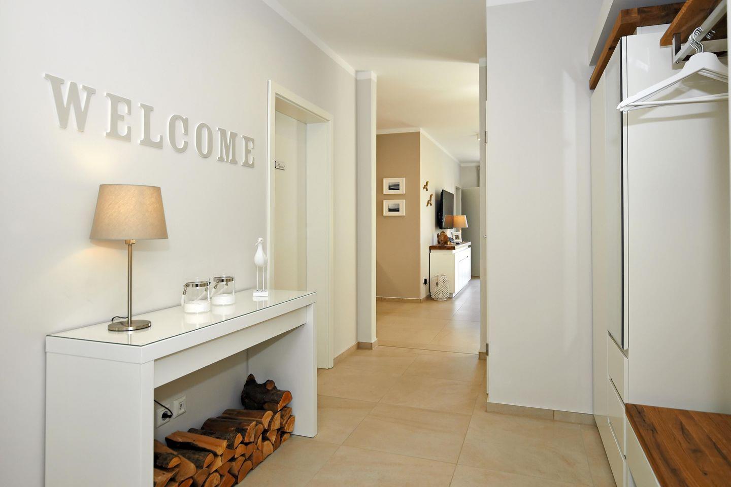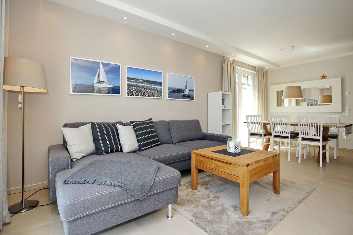 Die Wohn- und Schlafräume sind mit einem edlen Fliesenboden ausgestattet und eine Fußbodenheizung sorgt im gesamten Bereich „Meer“ für wohlige Wärme. Vor der Couch sorgt ein Teppich zusätzlich für Gemütlichkeit.