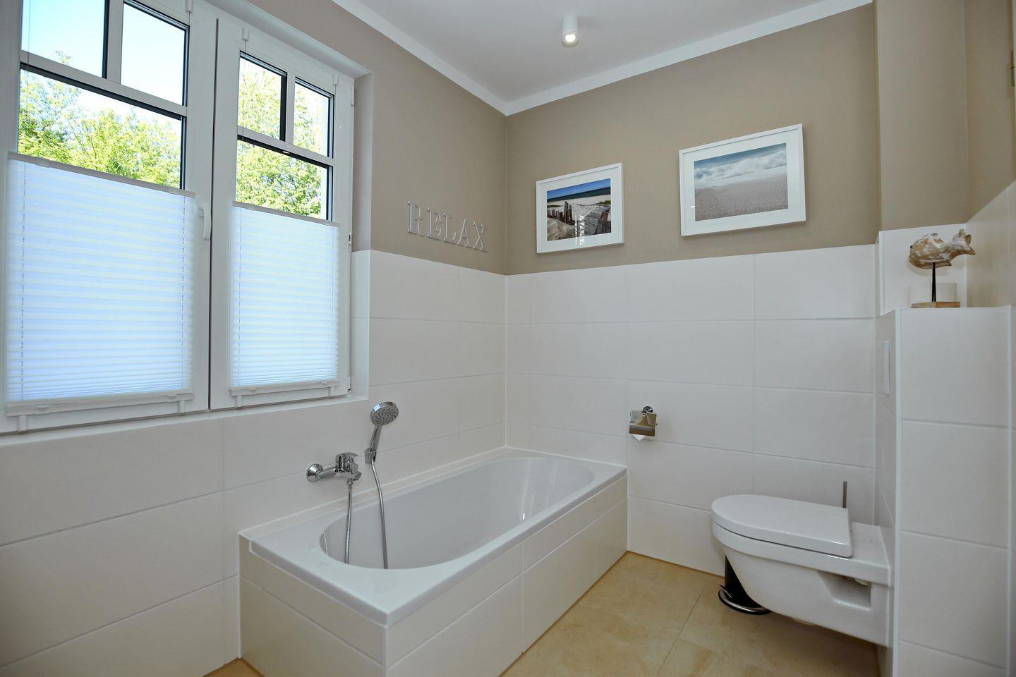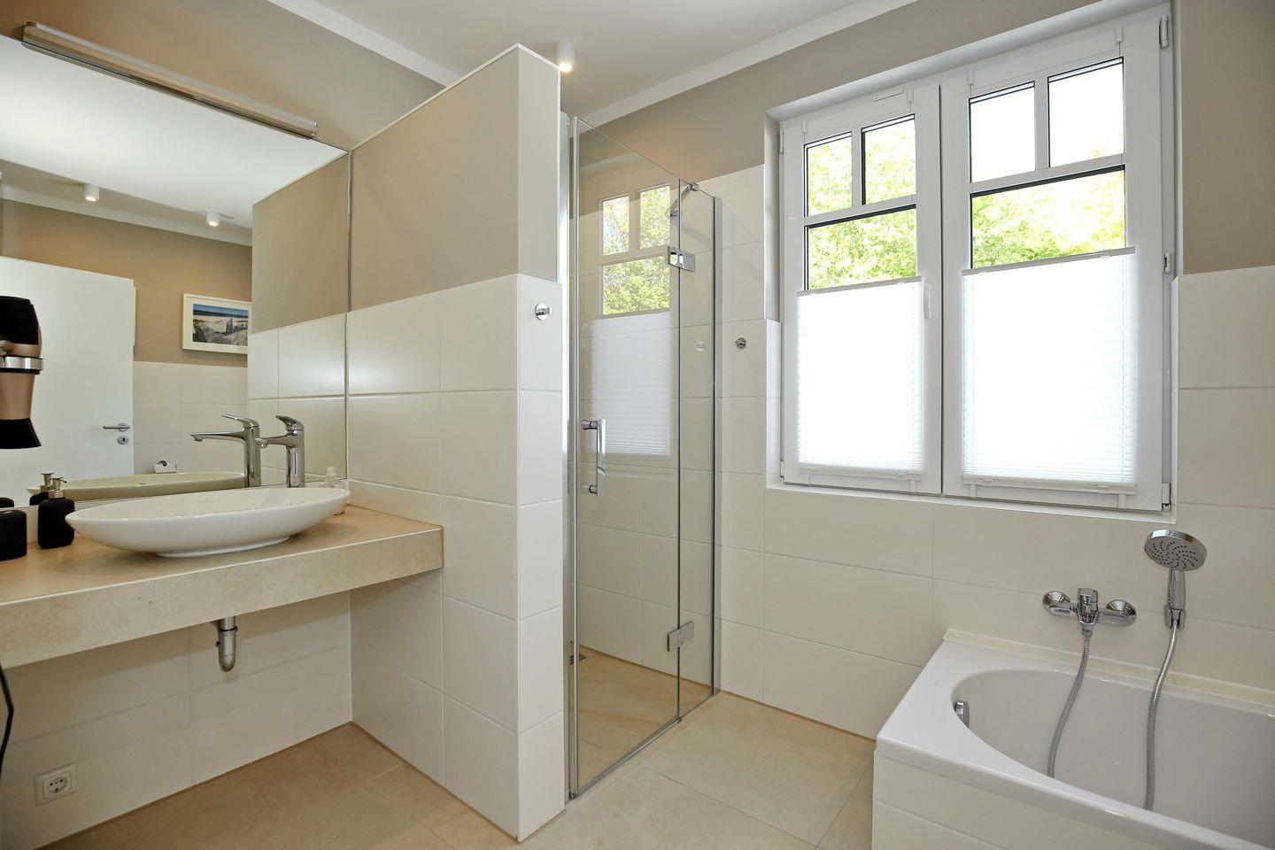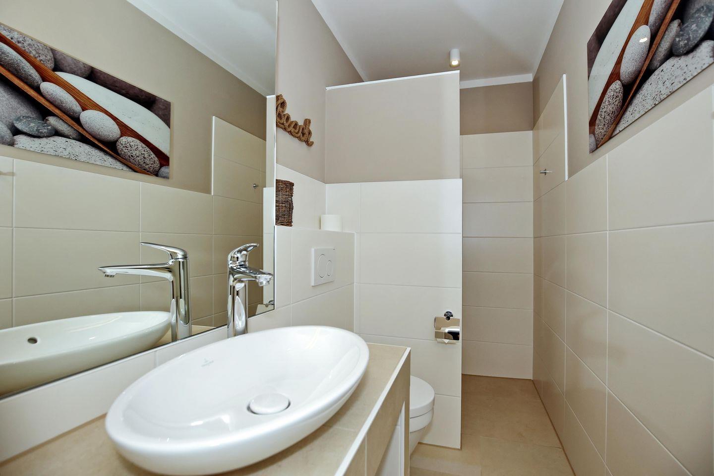 Das Tageslichtbad ist hell und gemütlich modern gestaltet und verfügt über eine ebenerdige Dusche, ein WC, eine Badewanne, einen Waschtisch mit Waschbecken, einen großen beleuchteten Spiegel sowie einen Kosmetikspiegel und einen Föhn. Das andere Badezimmer ist vom hinteren Doppelzimmer aus begehbar und ist mit einer ebenerdigen Dusche, einem WC und einem Waschtisch mit Waschbecken sowie einem großen beleuchteten Spiegel ausgestattet. Die Bäder sind gefliest.