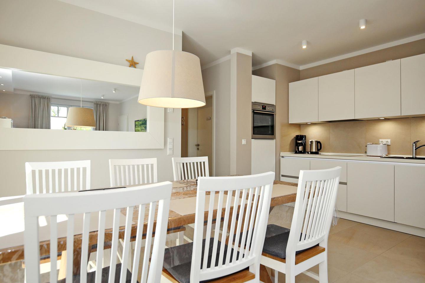 Die moderne Küchenzeile ist mit einem 4-Zonen-Cerankochfeld, einem Backofen, einem Geschirrspüler sowie einem Kühlschrank mit Gefrierfach voll ausgestattet. Technische Kleingeräte wie ein Wasserkocher, ein Toaster sowie ein Kaffeeservice stehen dir auf Knopfdruck zur Verfügung.