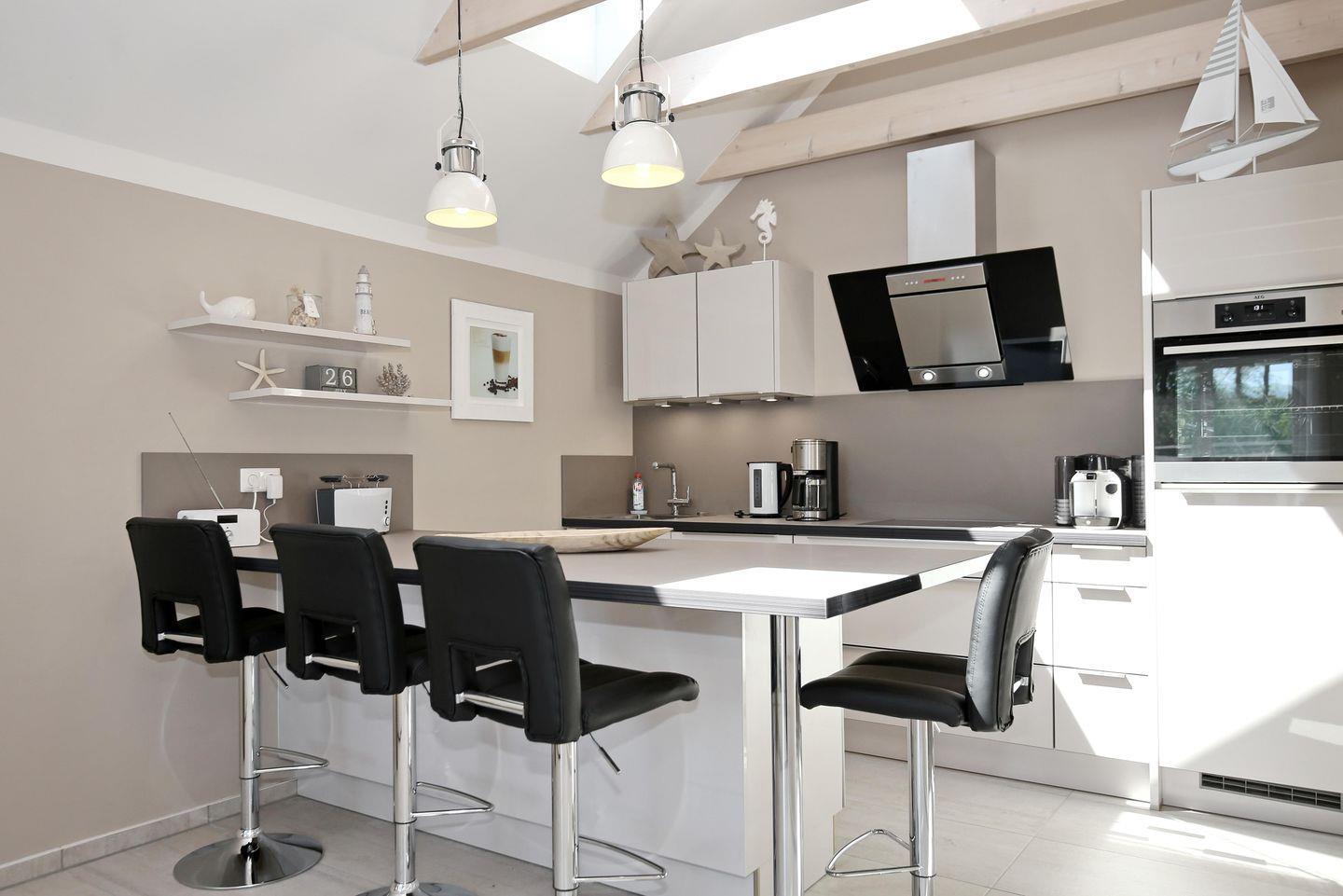 Die moderne Küchenzeile ist mit einem 4-Zonen-Cerankochfeld, einem Backofen, einem Geschirrspüler sowie einem Kühlschrank mit Gefrierfach voll ausgestattet. Technische Kleingeräte wie ein Wasserkocher, ein Toaster sowie eine Kaffeemaschine stehen dir zur Verfügung.