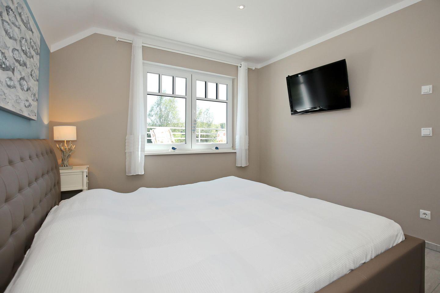 Im ersten Schlafzimmer empfängt dich ein bequemes Doppelbett mit zwei Matratzen (jeweils 100 x 200 cm) zur erholsamen Nachtruhe. Im zweiten Schlafzimmer befinden sich zwei Einzelbetten (je 90 x 200 cm). Ein großer Kleiderschrank und Nachttische bieten genügend Stauraum für dein Urlaubsgepäck. Ein Flatscreen-TV sorgt für spätabendliche Unterhaltung. Plissees dienen im vorderen Schlafzimmer und Badezimmer als Sichtschutz.