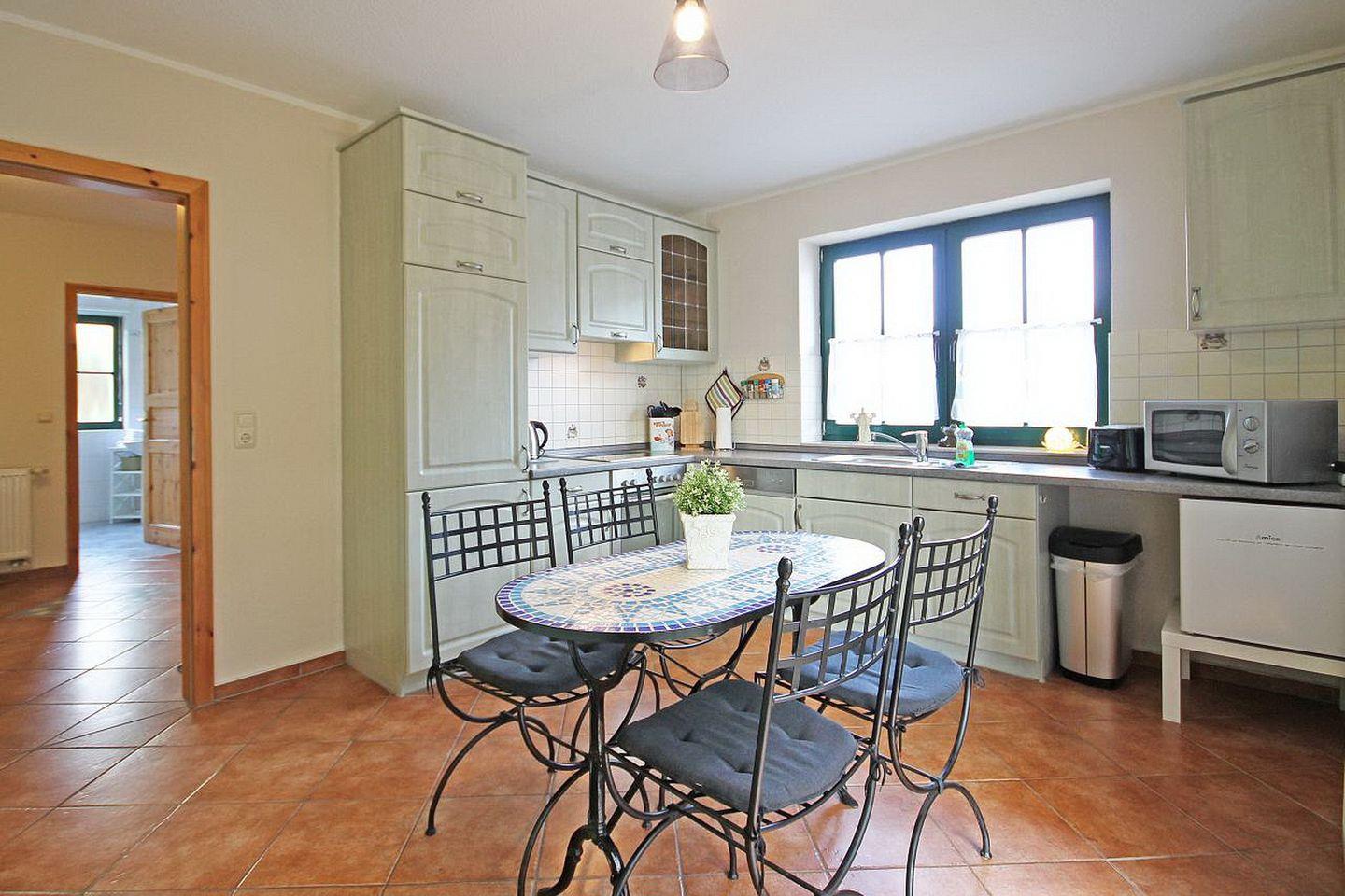Die Einbauküche ist mit einem Cerankochfeld (4 Kochzonen), einem Backofen, einem Geschirrspüler sowie einem Kühlschrank mit Gefrierfach und einer Mikrowelle voll eingerichtet. Ein Toaster, ein Wasserkocher und eine Kaffeemaschine vervollständigen die Küchenausstattung.