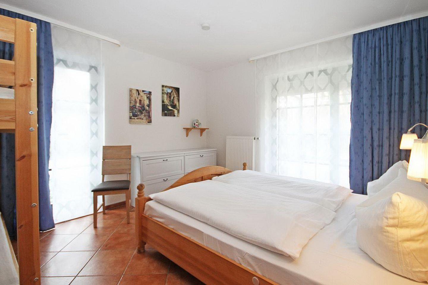 Das Schlafzimmer ist für Sie mit einem komfortablen Doppelbett (2 x 90 cm x 200 cm), einem großen Kleiderschrank und einem Etagenbett für Kinder eingerichtet. Zum Verdunkeln können Sie Vorhänge nutzen.