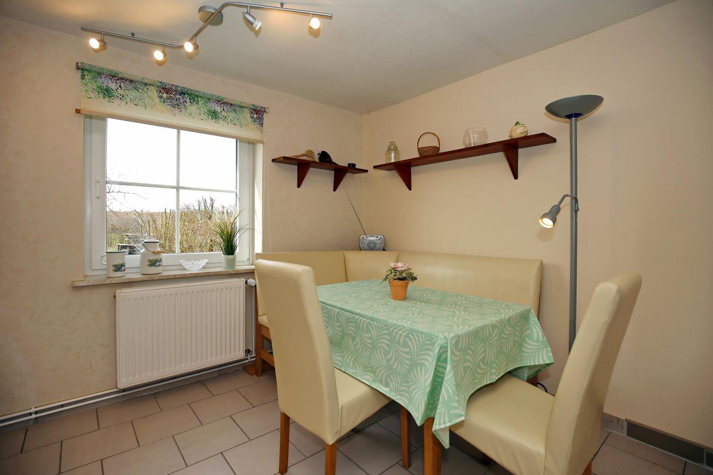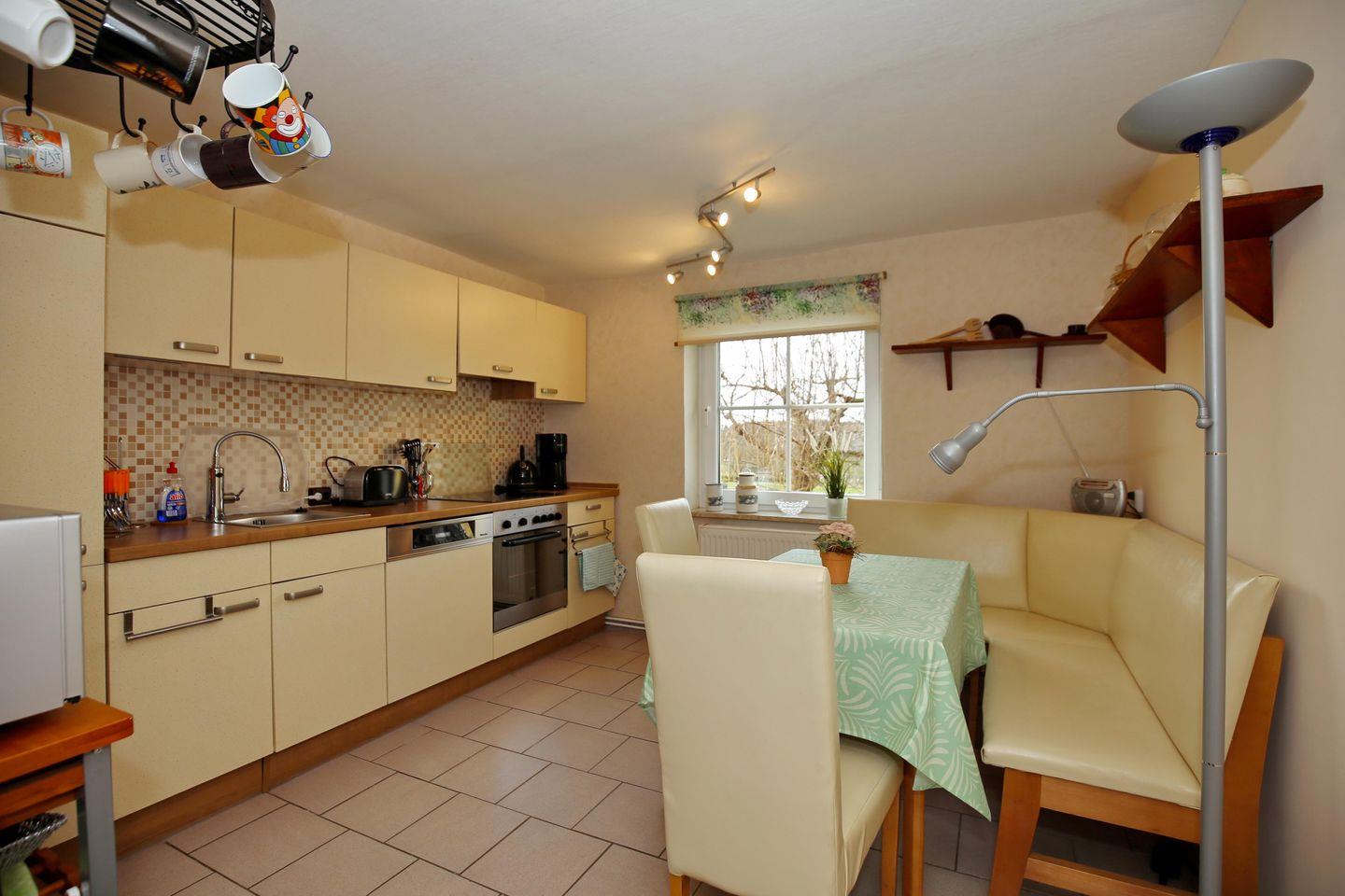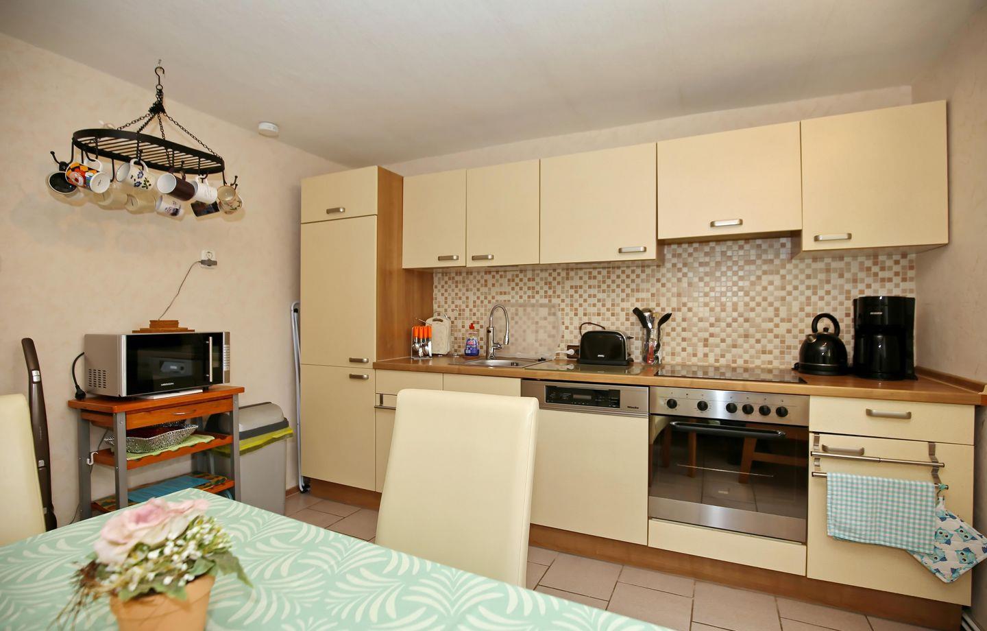 Die Einbauküche ist mit einem Cerankochfeld (4 Kochzonen), einem Backofen, einem Geschirrspüler sowie einem Kühlschrank mit Gefrierfach und einer Mikrowelle voll eingerichtet. Ein Toaster, ein Wasserkocher und eine Kaffeemaschine vervollständigen die Küchenausstattung.